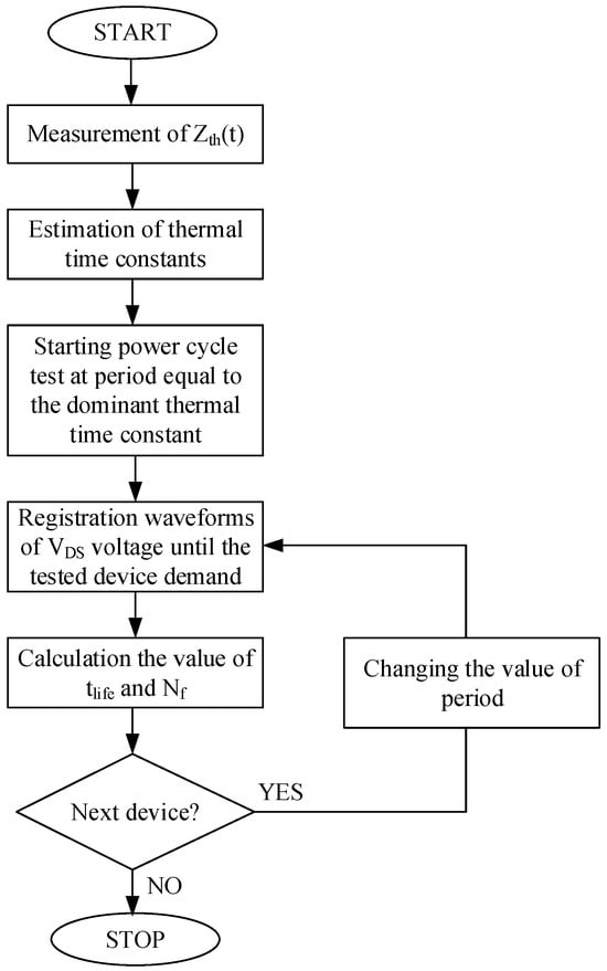 When a transistor is damaged, the ID current ceases, and the VDS voltage reaches zero. Once damage is detected, the recorded VDS voltage waveform is analyzed. Based on this waveform, the transistor’s time to failure tlife is read. The quotient of this time and the supply signal period equals the number of cycles to failure Nf. After completing the test for one transistor, it is replaced by another in the measurement system, a new switching frequency is selected, and described above steps are repeated. The test procedure is illustrated in Figure 12.