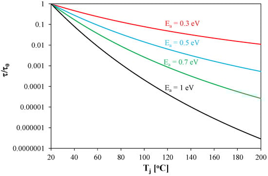 In order to illustrate the influence of the activation energy value on the lifetime of the components, the dependencies τ/τ0(Tj) were determined for selected Ea values equal to 0.3 eV, 0.5 eV, 0.7 eV and 1 eV, respectively. These dependencies are shown in Figure 13. In this figure, the scale in the vertical axis is logarithmic.