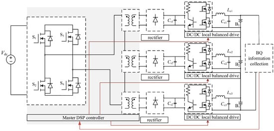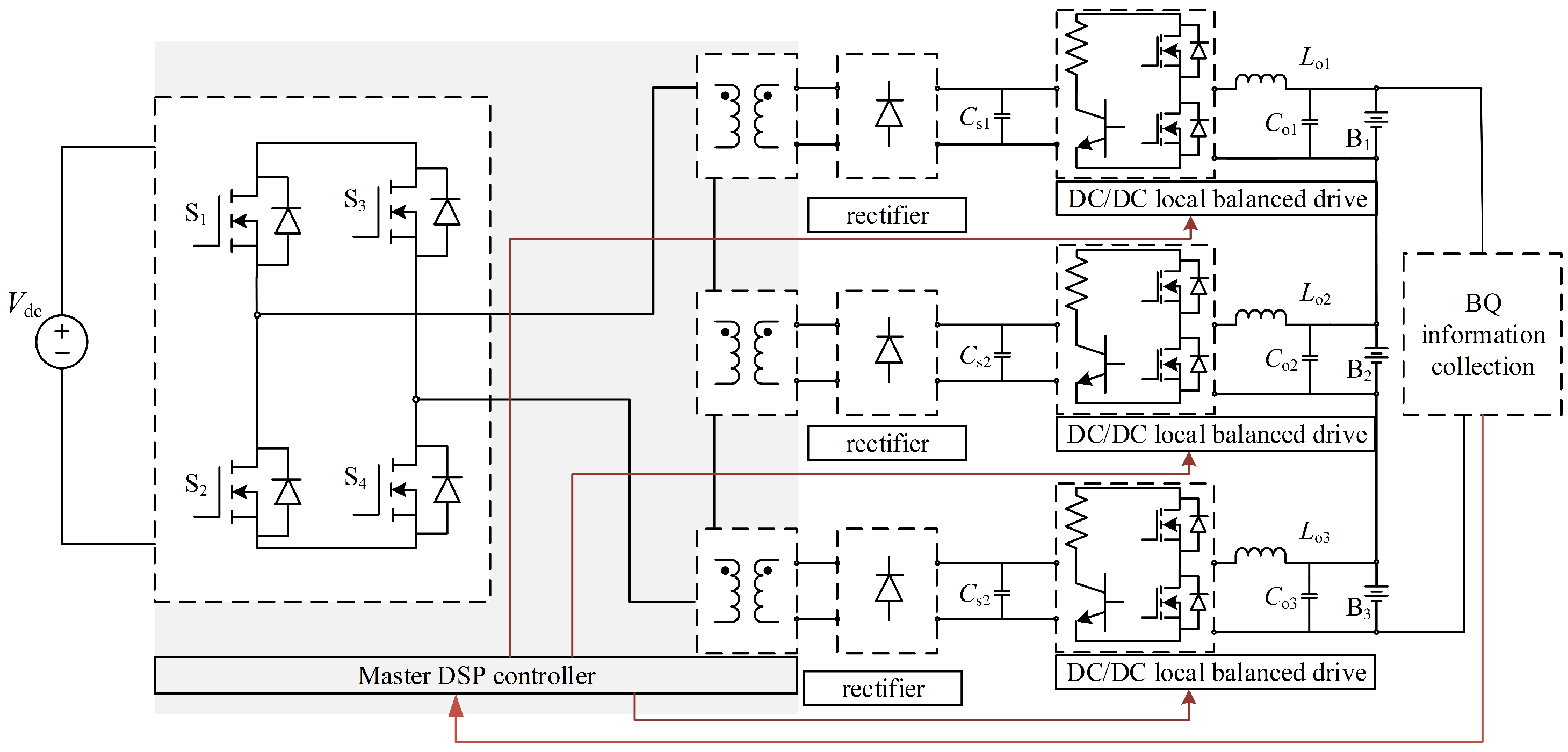 To address these challenges, this paper proposes a high-efficiency active balancing system for large-capacity battery modules, as illustrated in Figure 1. The system adopts a SIMO topology to achieve bidirectional energy transfer between high- and low-SOC cells. A small-signal model of the balancing circuit is established and a quasi-open-loop control for the primary-side full-bridge inverter, along with a dual closed-loop control strategy for the battery side, is designed. Digital control simulations are conducted on the QSPICE platform. Furthermore, a hybrid active–passive balancing method based on voltage-difference threshold is proposed, which adaptively switches between modes according to the real-time SOC, thereby achieving a trade-off between balancing speed and energy efficiency.