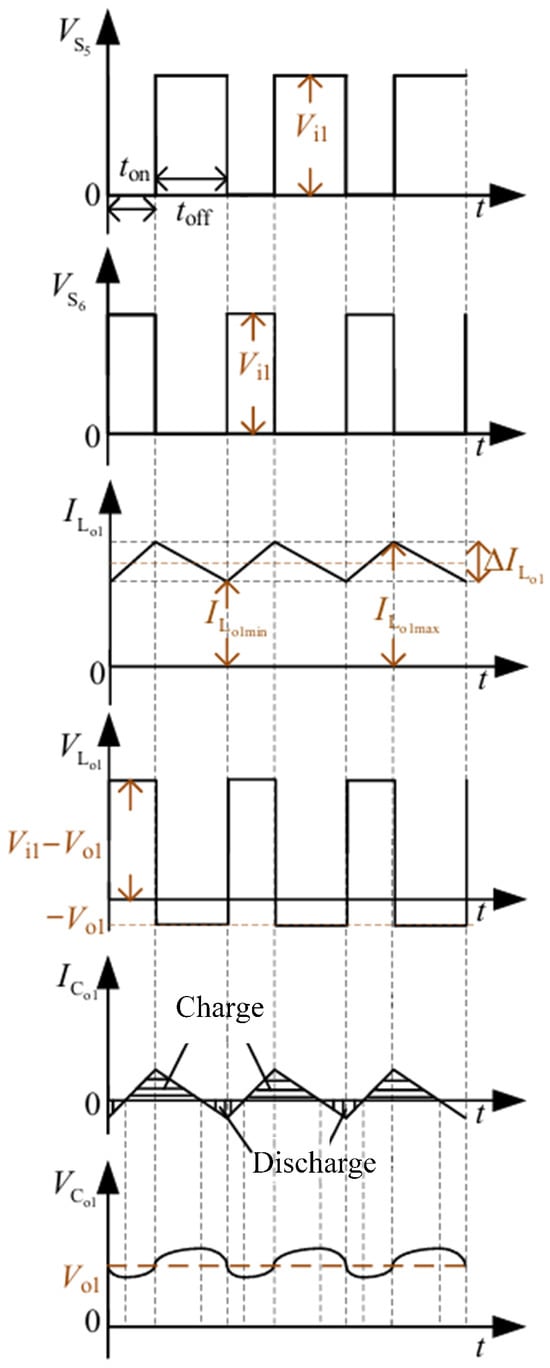 In the above equation, Δ I L ol - on is the variation of current I L ol when t = t on ; Δ I L ol - off is the variation of current I L ol when t = t off ; D 1 is the conduction duty cycle of S 5 , where D 1 = t on / T ; D 2 is the conduction duty cycle of S 6 , where D 2 = t off / T = 1 D 1 .