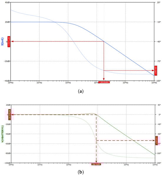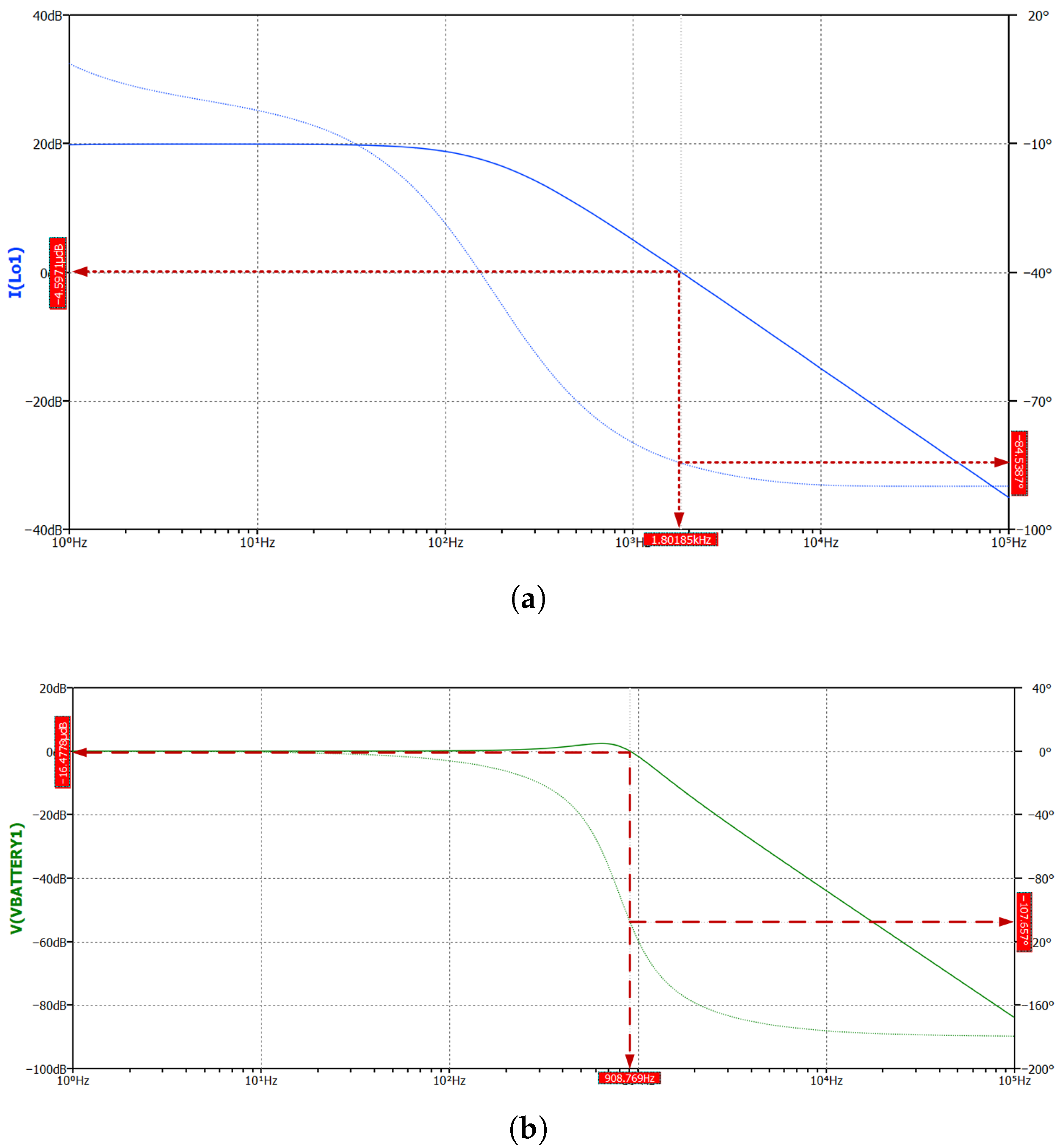 Figure 11. Frequency characteristics of the open-loop transfer function for CC and CV: (a) CC control; (b) CV control.