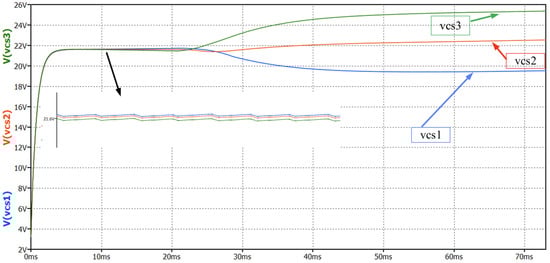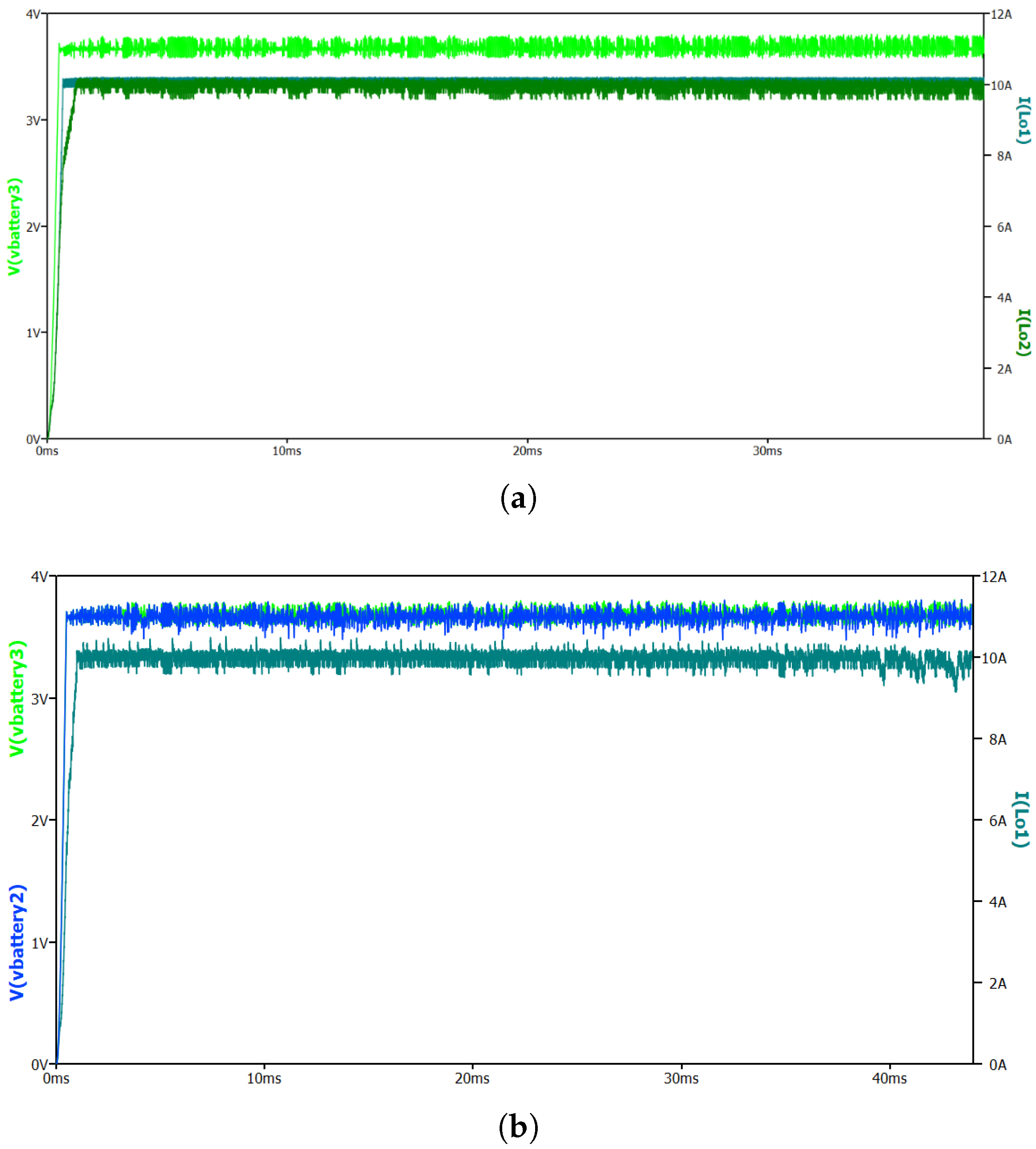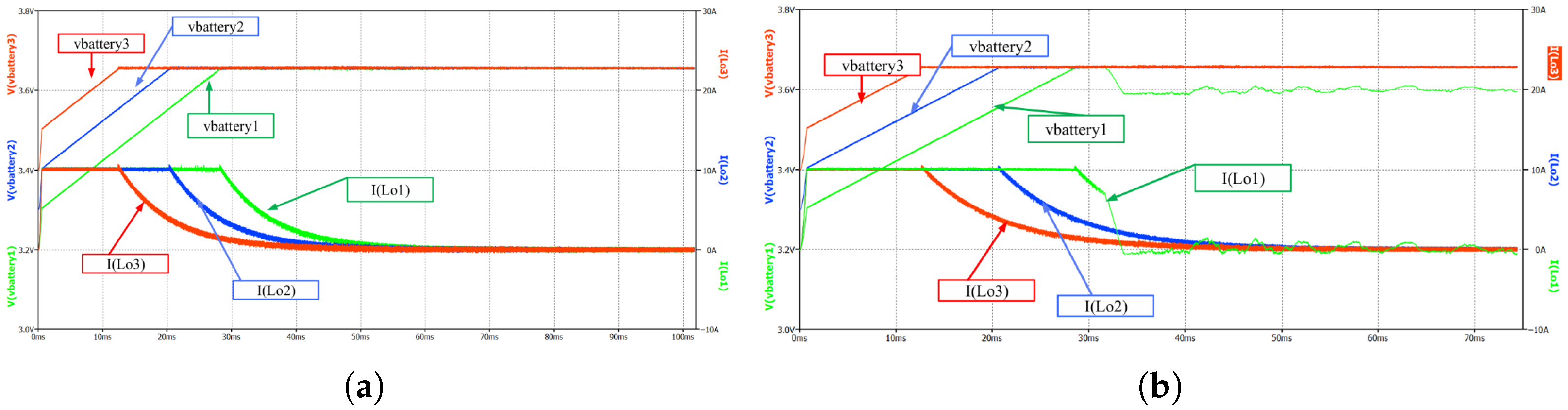 Figure 23. Output of the balancing module in different working modes: (a) two CC modes, one CV mode; (b) two CV modes, one CC mode.