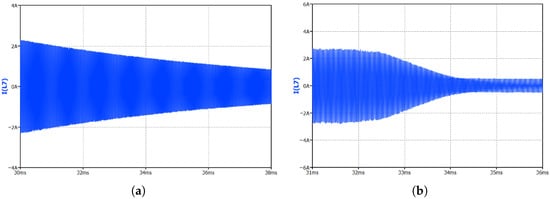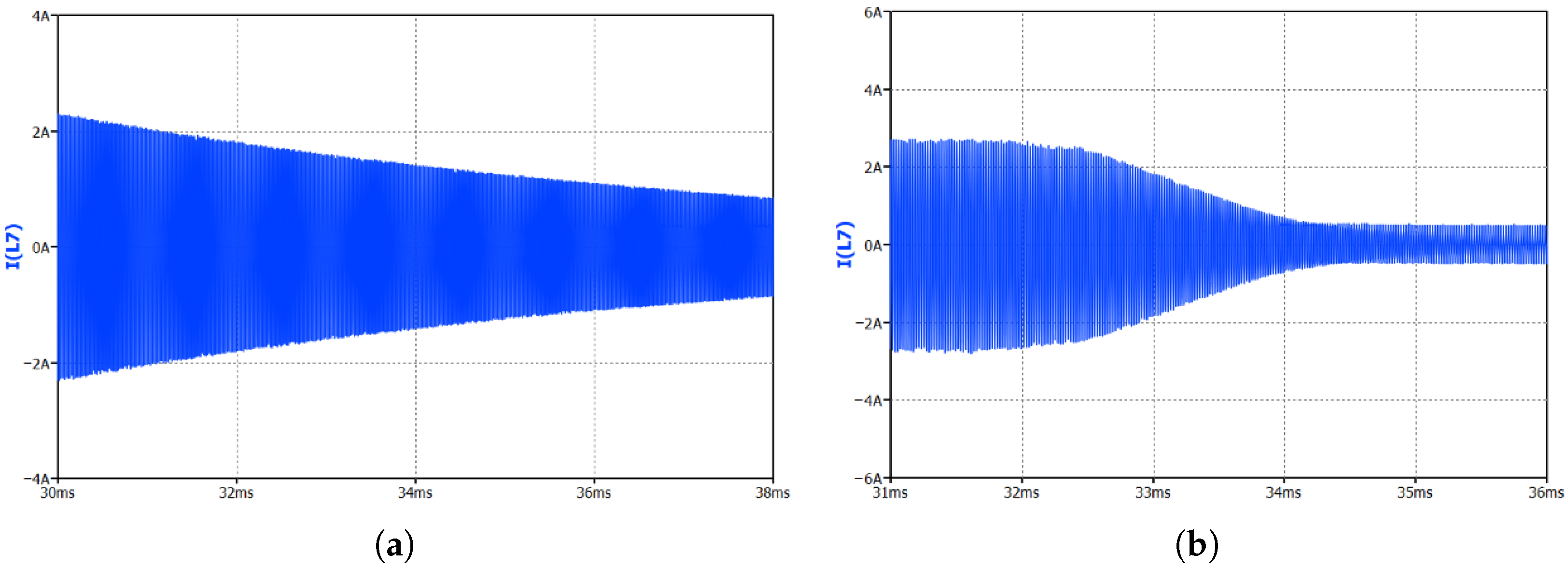 Figure 16. Transformer leakage current: (a) the transformation ratio is 1:1; (b) the transformation ratio is 1.5.