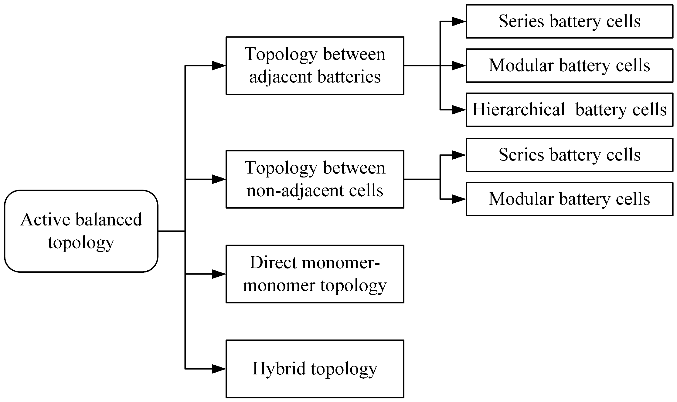 This study focuses on active balancing topologies, which achieve SOC equalization among cells by transferring excess energy from high-energy cells to low-energy ones. As illustrated in Figure 2, active balancing topologies can be categorized according to their energy transfer paths into adjacent-cell transfer, non-adjacent transfer, direct cell-to-cell transfer, and hybrid types. Each topology presents distinct trade-offs in terms of balancing speed, energy utilization, and control complexity [14].