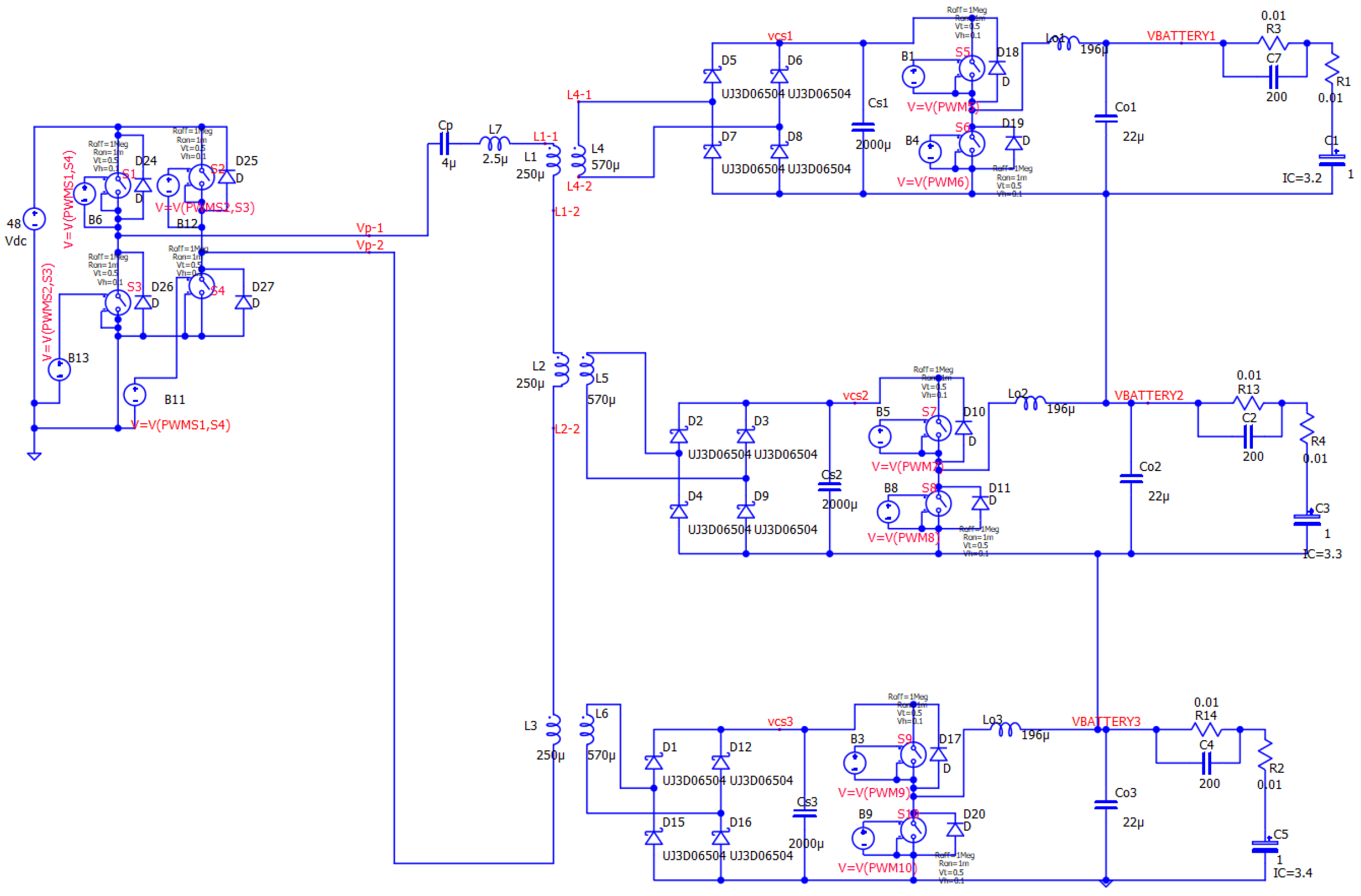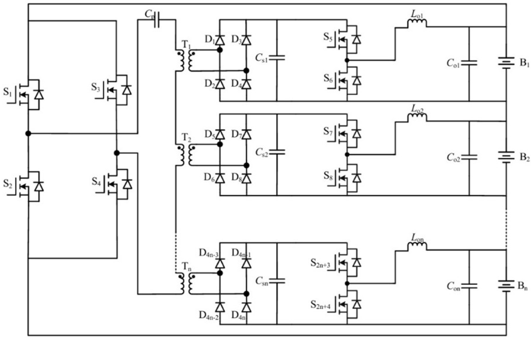 As shown in Figure 4, the primary-side full-bridge switches convert DC to high-frequency AC and distribute the voltage, while the secondary-side rectification and filtering provide DC to meet the requirements of downstream charging modules. The operation of this stage is not analyzed in detail here; the focus is on the working mode of the secondary-side charging modules of the transformers.