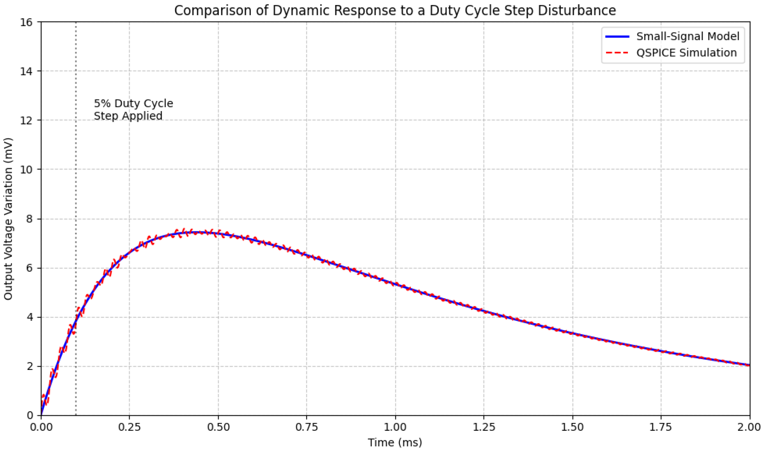 Figure 8. Comparison of the dynamic response to a duty cycle step disturbance between the derived small-signal model and the detailed QSPICE circuit simulation.
