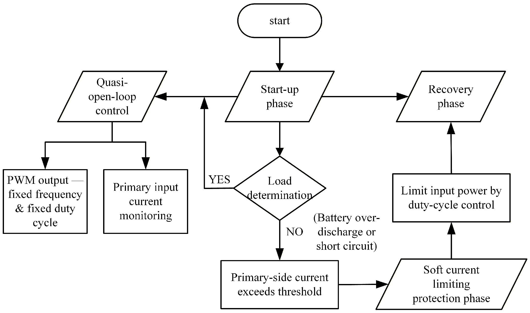 The primary-side full-bridge inverter in this system employs a hybrid control strategy that combines quasi–open-loop and current-limiting mechanisms to achieve efficient power transfer and system protection. Under normal operating conditions, a high-frequency voltage with fixed frequency and duty cycle is generated to deliver energy to the secondary side through the transformer. When the primary-side current exceeds the preset threshold, the current-limiting mechanism adjusts the duty cycle to restrict input power, thereby preventing overcurrent and ensuring overall system stability. The corresponding control logic diagram is shown in Figure 9.