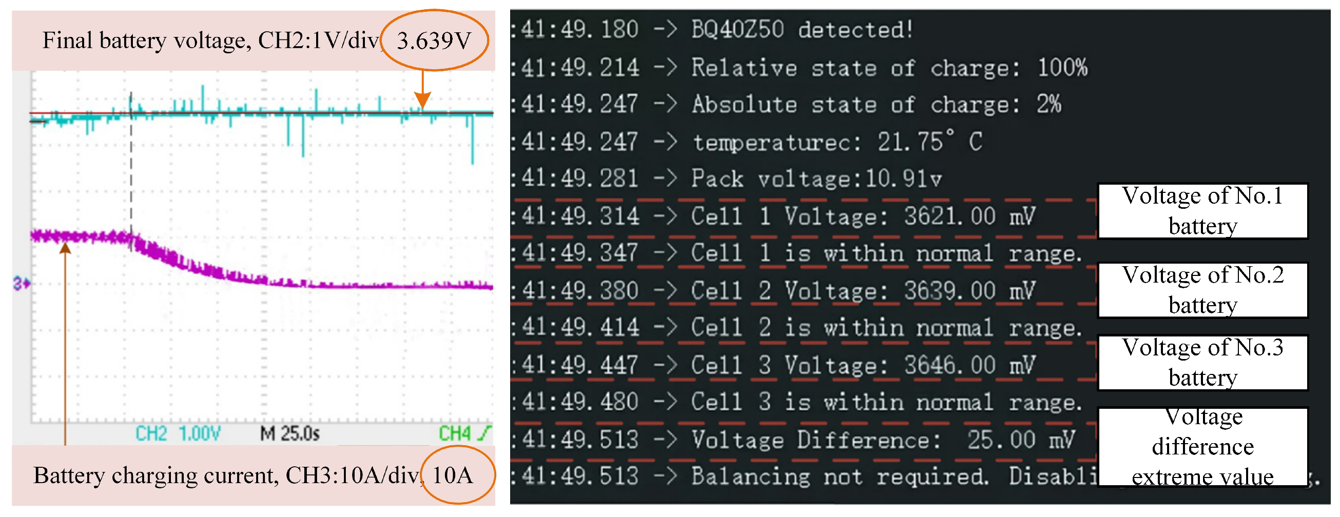 In the constant-current (CC) mode, the inner loop maintains a fixed charging current by adaptively modulating the PWM duty ratio, enabling fast and safe charging. When the terminal voltage reaches the reference value V ref , the system automatically switches to the constant-voltage (CV) mode. In the CV mode, the outer loop maintains a stable output voltage while gradually reducing the charging current according to the battery’s state of charge. This precise voltage regulation prevents overcharging and suppresses efficiency degradation caused by voltage fluctuations.