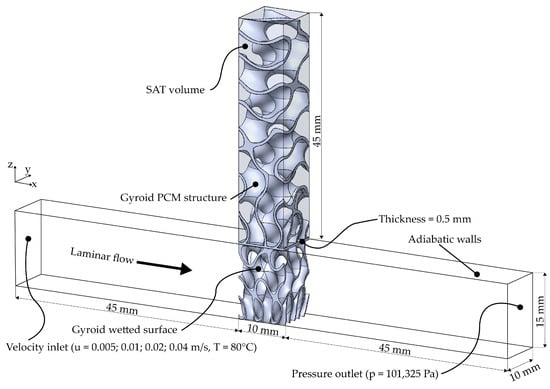 The geometry of the computational model consisted of two interconnected domains: a horizontally oriented channel with flowing liquid and a vertical storage module filled with PCM and the metallic gyroid structure. The layout of the model, including the main dimensions, boundary conditions, and spatial orientation of the coordinate axes, is shown in Figure 3. This configuration was designed to allow accurate analysis of heat transfer from the flowing fluid into the metallic structure and subsequently into the sodium acetate trihydrate, with the gyroid functioning as a thermally conductive bridge transporting energy into the PCM volume.