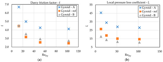 (a) Darcy friction factor versus Reynolds number for the three gyroid variants; (b) Local pressure loss coefficient ξ versus Reynolds number.