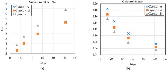 (a) Nusselt number versus Reynolds number; (b) Colburn j-factor versus Reynolds number for the three gyroid geometries.