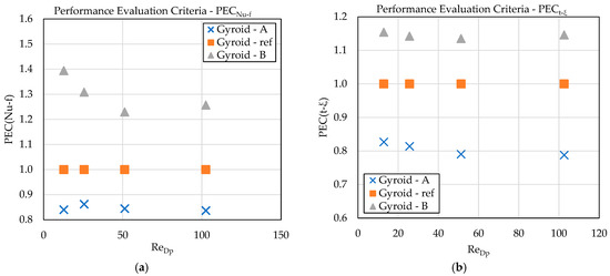 The overall thermo-hydraulic effectiveness of the individual geometries is captured by two PEC criteria. The first, PECNu–f, which compares the increase in heat transfer with the increase in hydraulic resistance, shows that Gyroid-B reaches values significantly above 1 across the entire Reynolds-number range. This indicates that its enhanced heat-transfer performance is achieved without a disproportionate rise in pressure drop. The Gyroid-A yields value below 1, confirming that the heat-transfer enhancement in variant A is insufficient to compensate for its high losses.