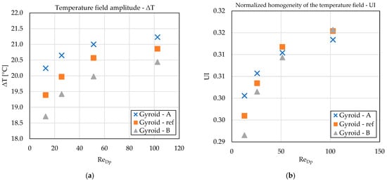 The homogeneity of the temperature field within the PCM is a key criterion for practical use. The temperature-amplitude ΔT shown in Figure 8a demonstrates that Gyroid-B provides the most uniform temperature distribution in the PCM, exhibiting the lowest ΔT values across all flow velocities. Geometry A, conversely, shows the highest temperature gradients, resulting from concentrated heat conduction in the dense lower part of the structure. The normalized homogeneity index UI depicted in Figure 8b, confirms this outcome: Gyroid-B achieves the lowest UI values, and thus the best homogenization, while Gyroid-A exhibits the poorest.