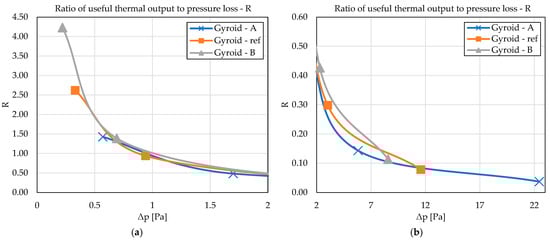 The graph in Figure 9a shows that the parameter R is strongly nonlinear and reaches its highest values at the lowest pressure drops, that is, in the region of the lowest flow velocities. At very small values of Δp (around 0.3–0.5 Pa), Gyroid-B exhibits the highest values, reaching R ≈ 4.2, while the reference variant is around 2.6 and Gyroid-A approximately 1.4. This pronounced difference arises from the combination of two factors: Gyroid-B provides a highly useful heat flux while maintaining very low hydraulic resistance, whereas Gyroid-A, although transferring more heat than the reference variant, experiences such large pressure losses that its resulting R parameter remains low.