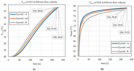 As shown in the table and in the Tmin graph for a flow velocity of 0.04 m/s in Figure 10a, Gyroid-B reaches the threshold temperature of 58 °C first, specifically at approximately 216 s. The reference gyroid reaches the same threshold slightly later (224 s), while Gyroid-A is the slowest (228 s). This trend is observed at all flow rates in Table 2, indicating that the gradation orientation with the largest pores at the base (variant B) leads to faster heat transfer into the coldest regions of the PCM and thus to faster overall heating of the volume to the melting threshold. The Tmax graph for a flow velocity of 0.04 m/s in Figure 10b provides a complementary perspective: Gyroid-A exhibits the highest values of maximum PCM temperature throughout the entire heating process, indicating concentrated heat conduction through the dense lower part of the structure, but also greater non-uniformity. The reference gyroid exhibits slightly lower Tmax values, while Gyroid-B shows the lowest Tmax at time t58. Specifically, at 0.04 m/s, Tmax(t58) is 79.23 °C for A, 78.93 °C for the reference, and only 78.47 °C for B.