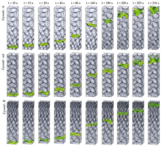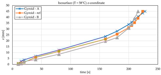 The time evolution of the z-coordinate of the isotherm, shown in Figure 11, reveals that during the early stages of heating (t < 100 s) all three geometries behave rather similarly, and the thermal front advances upward at nearly the same rate. The differences begin to intensify only during the later stage of the heating process. The fastest upward movement of the isotherm toward the top of the PCM is observed for Gyroid-A, which is linked to concentrated heat conduction through the dense lower portion of its structure. The reference gyroid exhibits a slightly slower progression. Interestingly, Gyroid-B behaves differently: in the initial stages it shows the slowest advance of the isotherm, but its curve rises more steeply later, and at several time points it catches up with or slightly surpasses the reference geometry. This behavior suggests that although Gyroid-B is highly open in its lower region—resulting in a more spatially distributed heat-transfer zone on the wetted surface, its progressively densifying upper region enables efficient upward redistribution of heat once the PCM becomes more uniformly warmed.