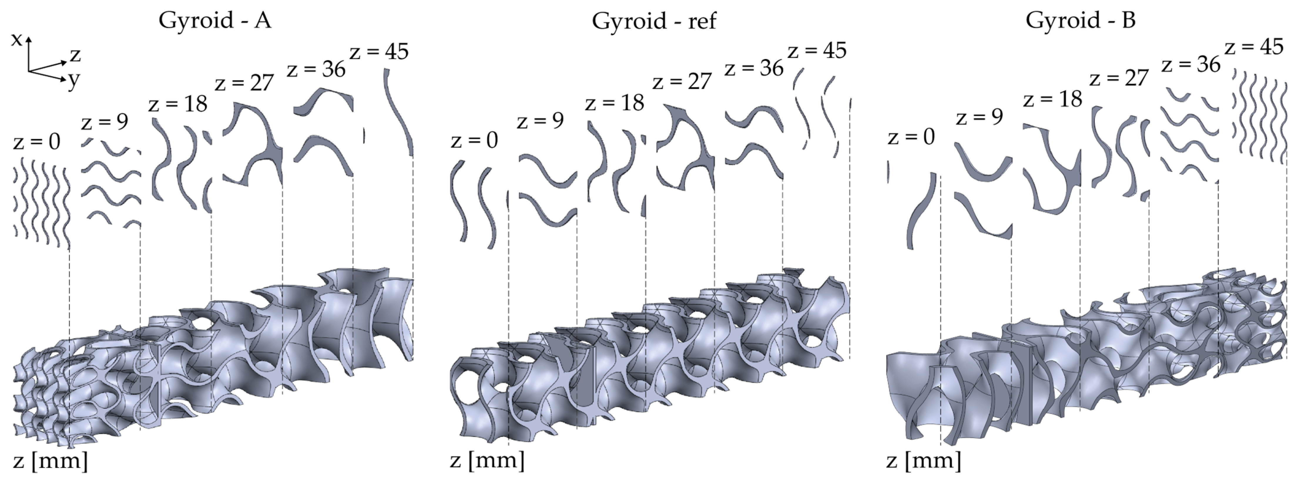 Geometric modifications were then applied to this base shape to introduce a gradual change in local porosity along the z-axis. The reference structure (Gyroid-ref) was preserved in a uniform state, i.e., with a constant period scaling throughout the entire volume, resulting in cross-sections at different heights that exhibit nearly identical topology and pore size.