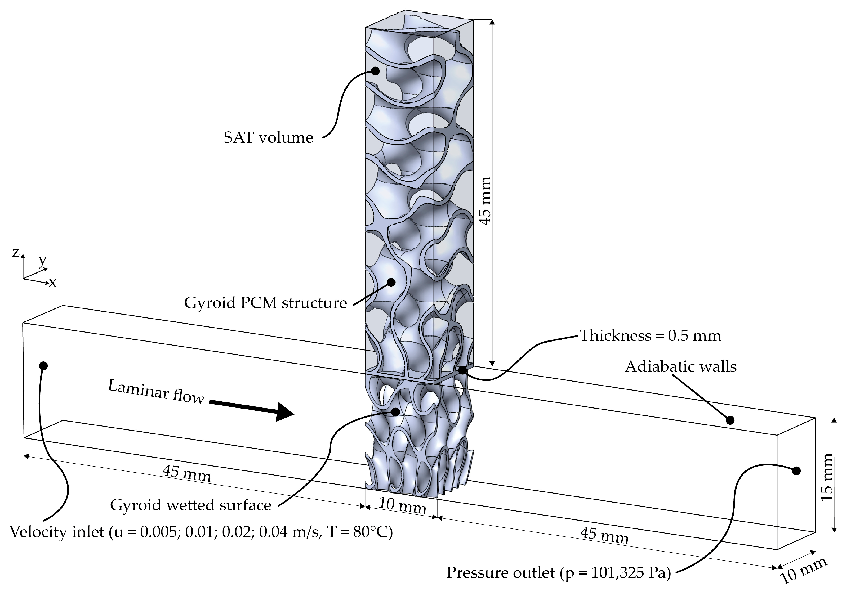 is equal to zero because these are stationary solid phases, and heat transfer is therefore governed purely by conduction. The simulation thus represents a fully coupled conjugate heat-transfer problem in which the energy equations are solved simultaneously in the fluid, the gyroid structure, and the PCM, with continuous temperatures and heat fluxes enforced at their interfaces.