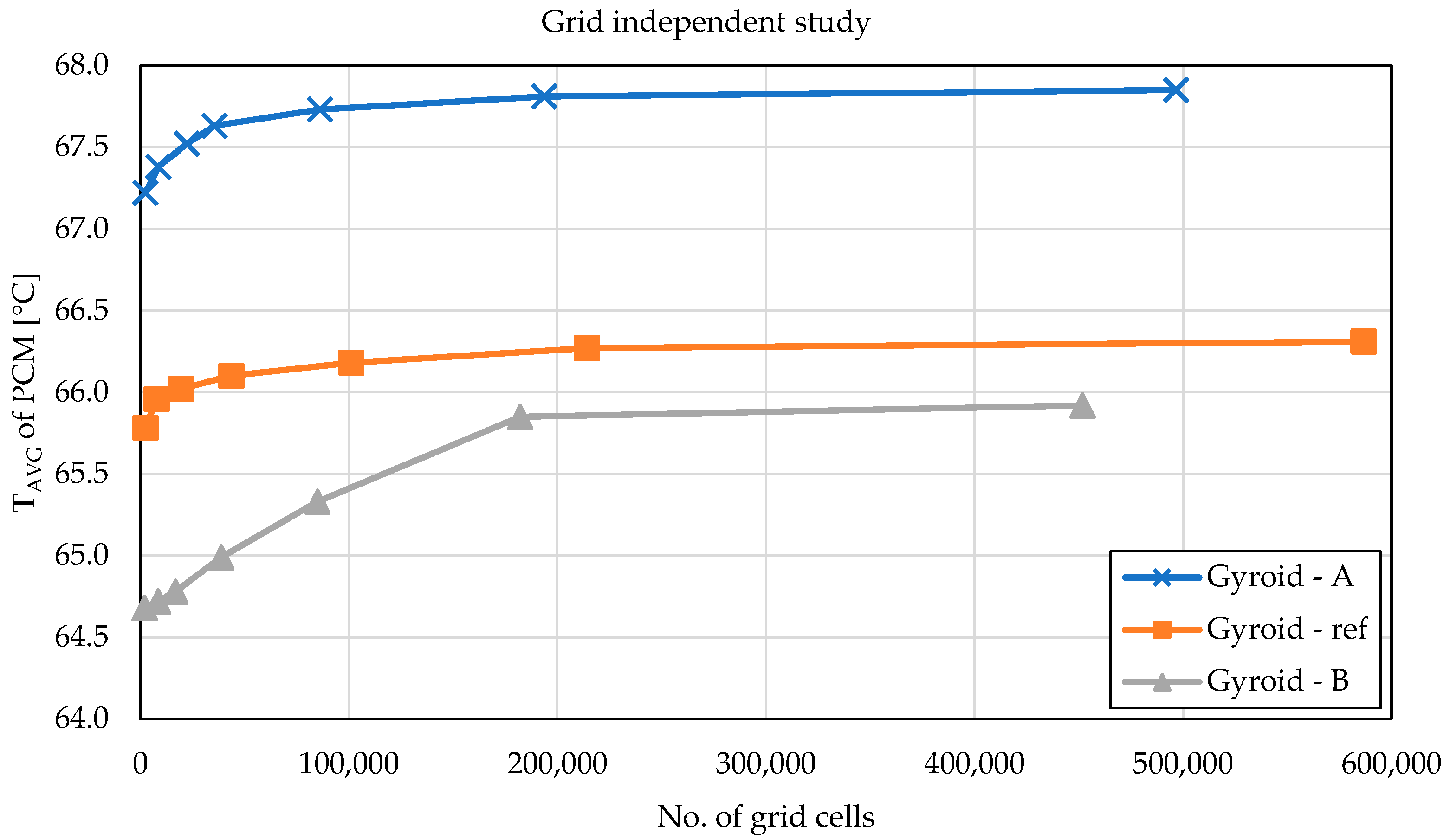 The reliability of the numerical solution was verified through a grid-independence study. For all three gyroid variants (A, reference, and B), several simulations were carried out with progressively refined meshes; the evaluated metric was the average PCM temperature at a defined charging time. The graph in