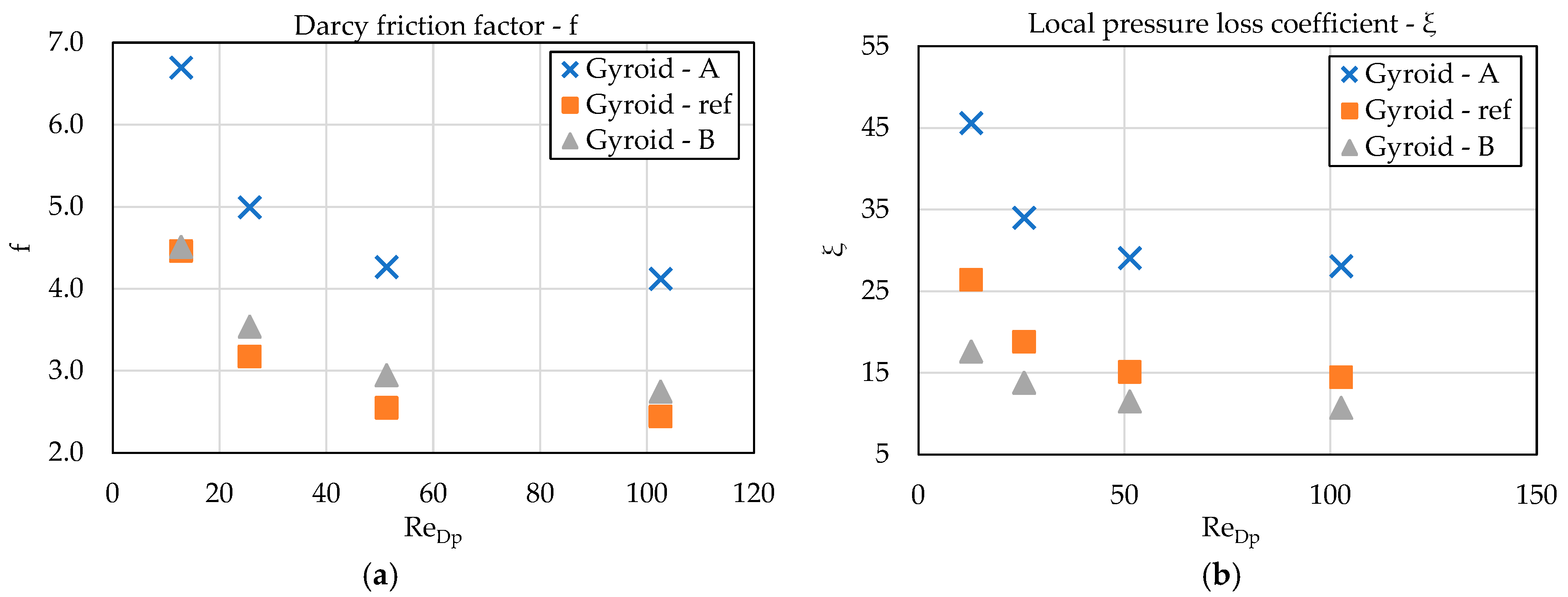 In this region, the most pronounced narrowing of the flow channels occurs, which leads to increased shear stresses and a higher-pressure gradient. In contrast, Gyroid-B exhibits the lowest friction-factor values because its largest pores are located directly at the fluid interface, allowing smoother flow with reduced obstruction. The reference gyroid shows intermediate values, which is expected given its homogeneous periodic structure. The same trend is observed for the local pressure-loss coefficient ξ at