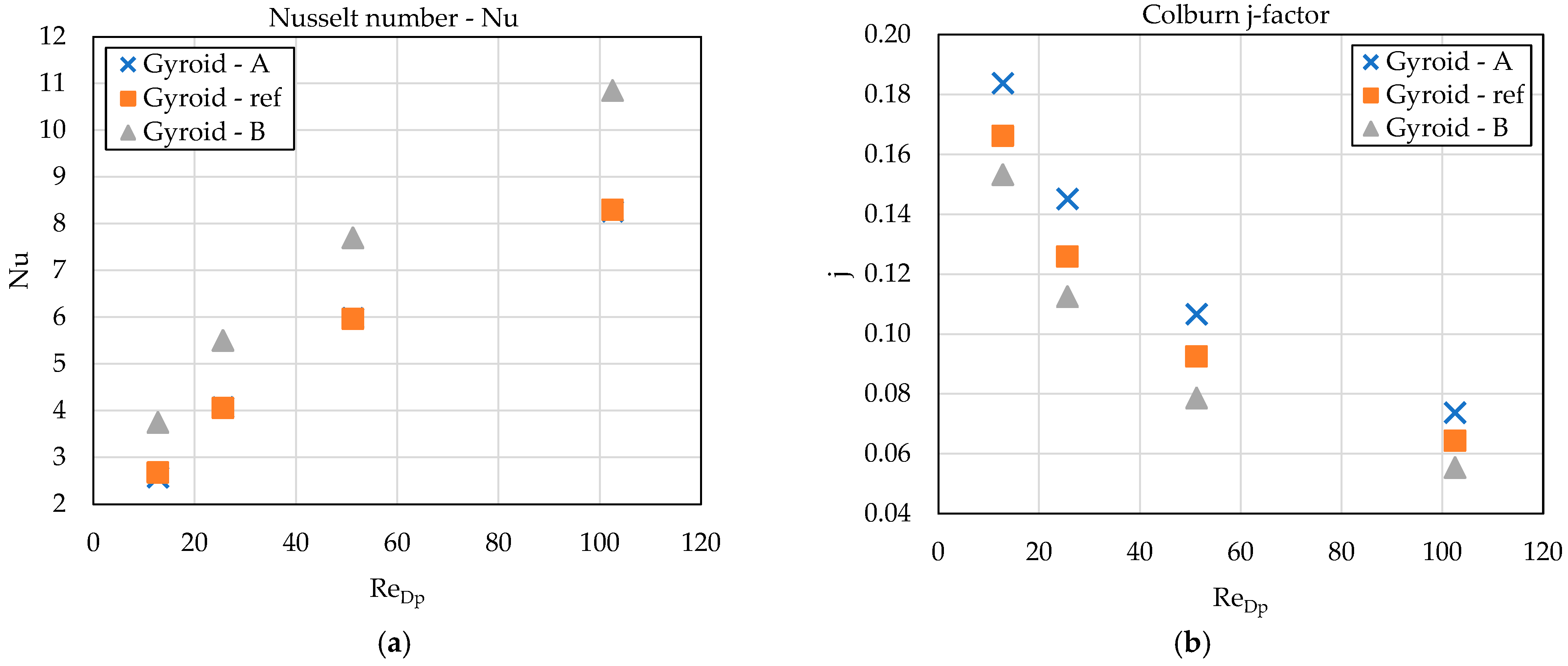 p is the hydraulic diameter of the TPMS pore. This parameter makes it possible to identify the influence of geometric variation of the gyroid on flow resistance. By comparing the relationship f = f(Re) between the individual geometries, it is possible to assess what portion of the hydraulic penalty is caused by changes in porosity at the base of the gyroid. The intensity of heat transfer from the liquid to the metallic structure was evaluated using the Nusselt number [