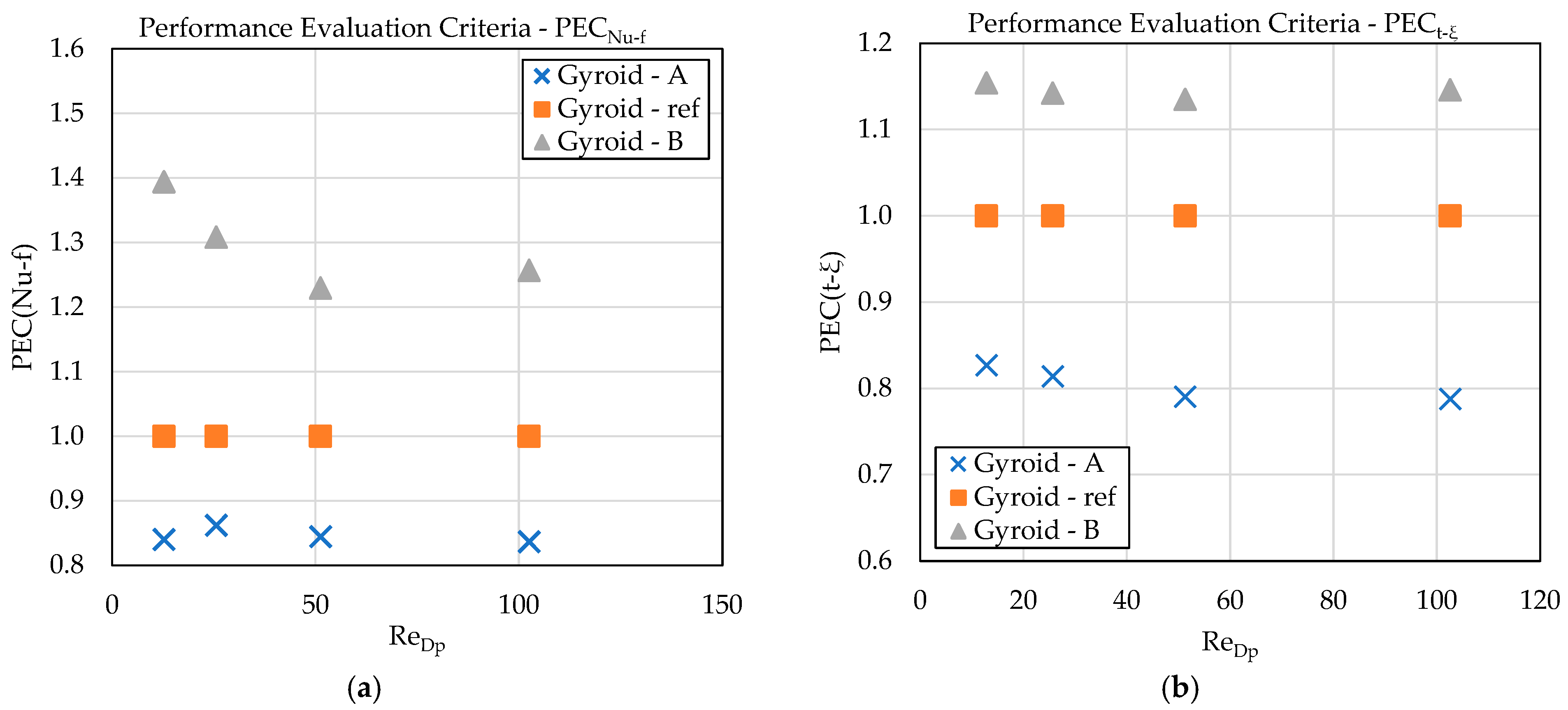 The thermo-hydraulic performance of the gyroid structure was assessed using the Performance Evaluation Criteria—PEC
