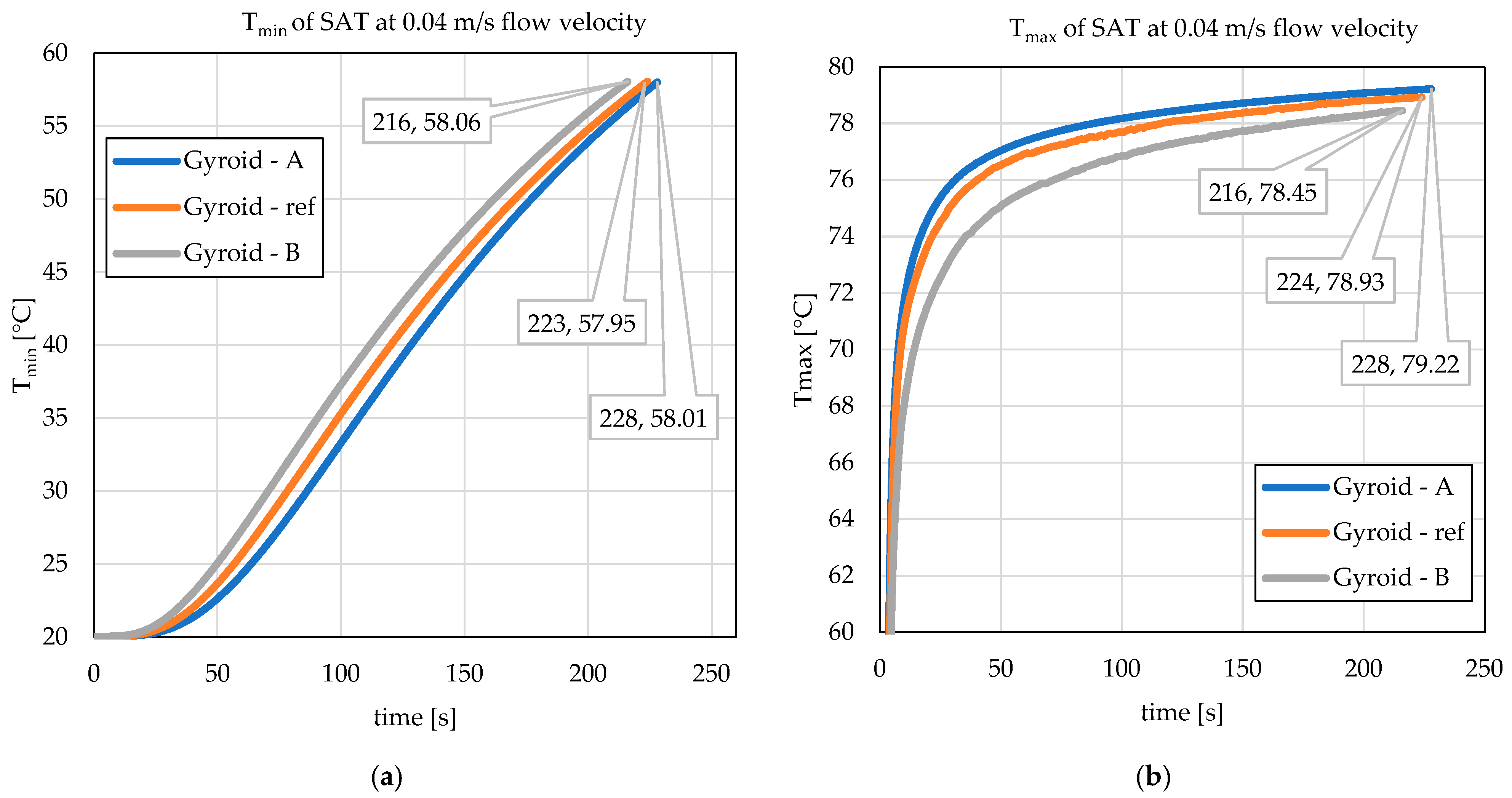 Figure 10a, Gyroid-B reaches the threshold temperature of 58 °C first, specifically at approximately 216 s. The reference gyroid reaches the same threshold slightly later (224 s), while Gyroid-A is the slowest (228 s). This trend is observed at all flow rates in