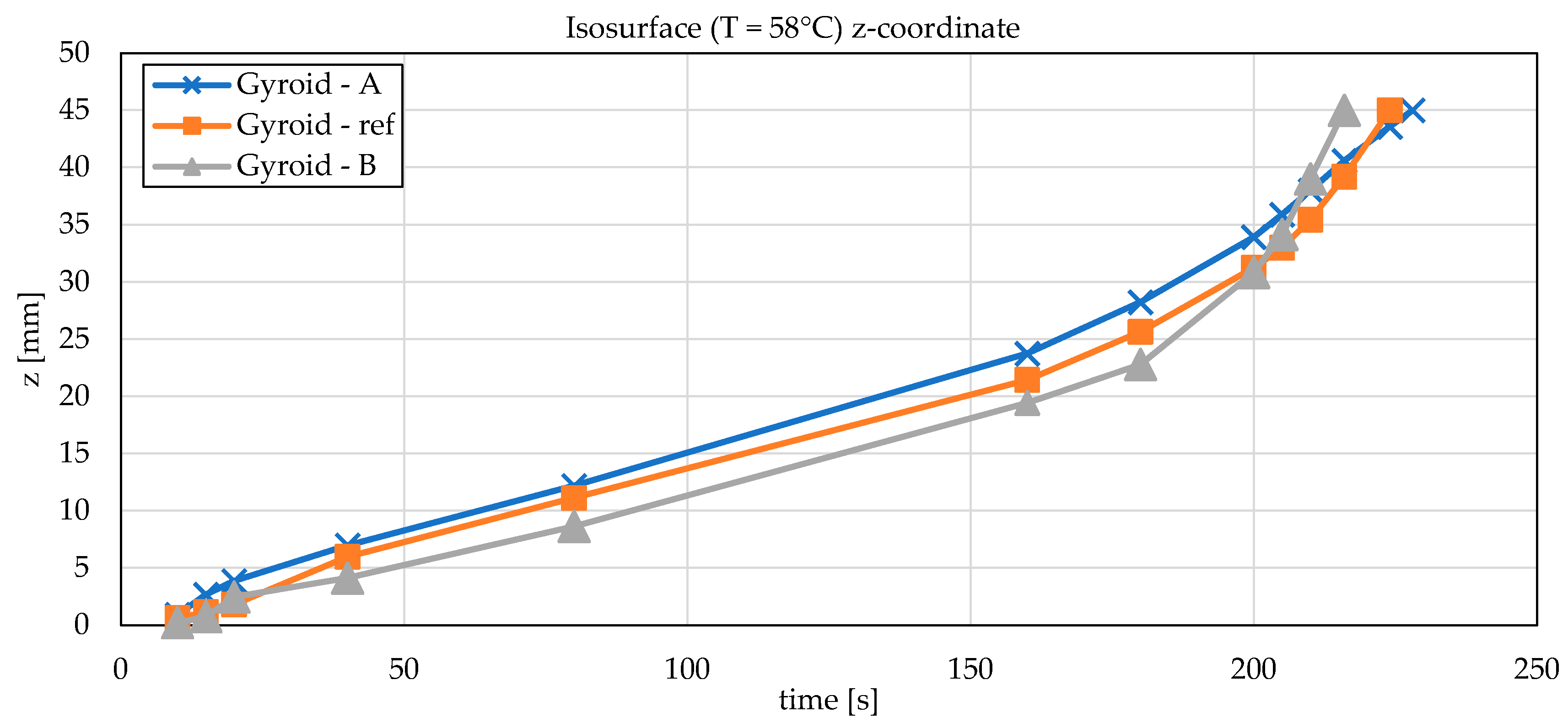 Figure 11, reveals that during the early stages of heating (t < 100 s) all three geometries behave rather similarly, and the thermal front advances upward at nearly the same rate. The differences begin to intensify only during the later stage of the heating process. The fastest upward movement of the isotherm toward the top of the PCM is observed for Gyroid-A, which is linked to concentrated heat conduction through the dense lower portion of its structure. The reference gyroid exhibits a slightly slower progression. Interestingly, Gyroid-B behaves differently: in the initial stages it shows the slowest advance of the isotherm, but its curve rises more steeply later, and at several time points it catches up with or slightly surpasses the reference geometry. This behavior suggests that although Gyroid-B is highly open in its lower region—resulting in a more spatially distributed heat-transfer zone on the wetted surface, its progressively densifying upper region enables efficient upward redistribution of heat once the PCM becomes more uniformly warmed.