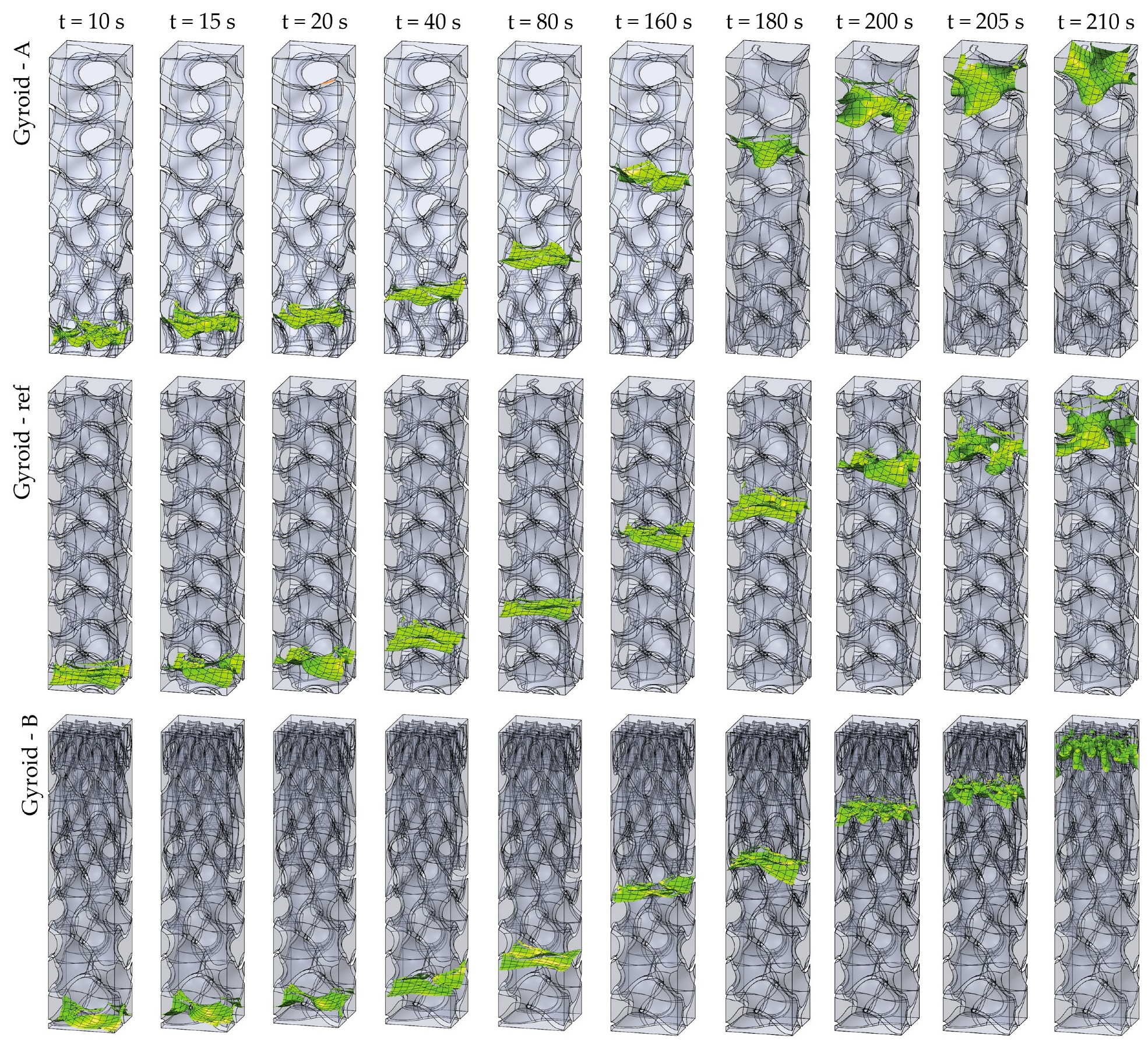 Analysis of the propagation of the T = 58 °C isotherm provides further insight into the differences between the geometric variants. In Gyroid-A, the isosurface advances in the form of narrow thermal channels aligned with the thickest metallic connections. This channel-like behavior explains the rapid local heating but also the pronounced temperature non-uniformity. The reference gyroid yields a more stable but still not fully uniform thermal front. Gyroid-B, however, produces the most compact and uniform isothermal surface, which progresses upward smoothly and without noticeable asymmetries or local protrusions. This observation is consistent with the lowest temperature amplitude ΔT and the highest homogeneity index UI among all variants, confirming the synergistic effect of its gradation.