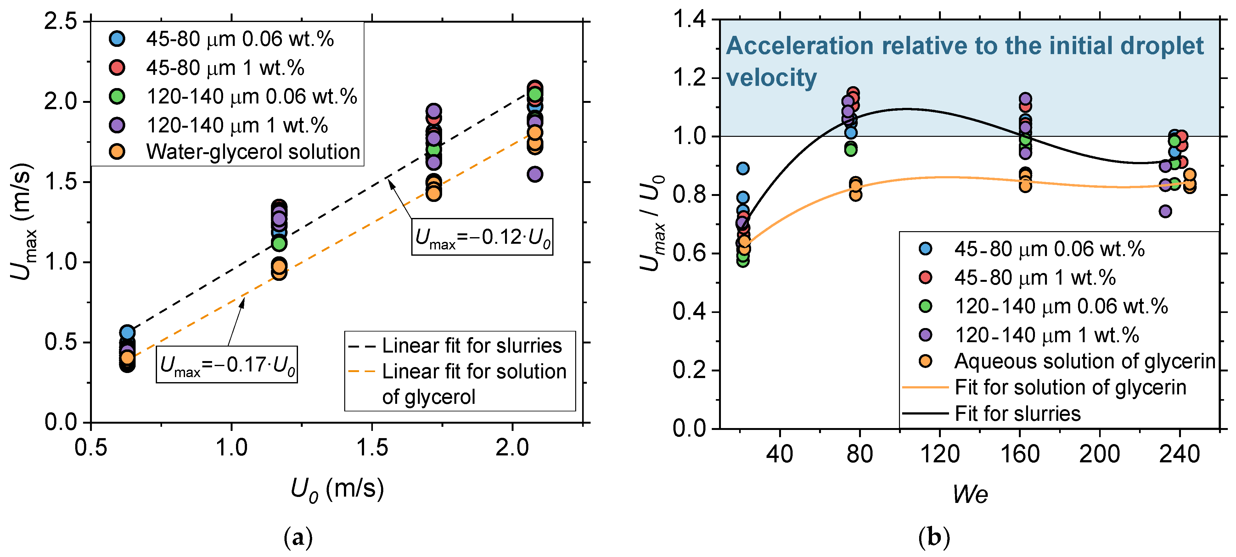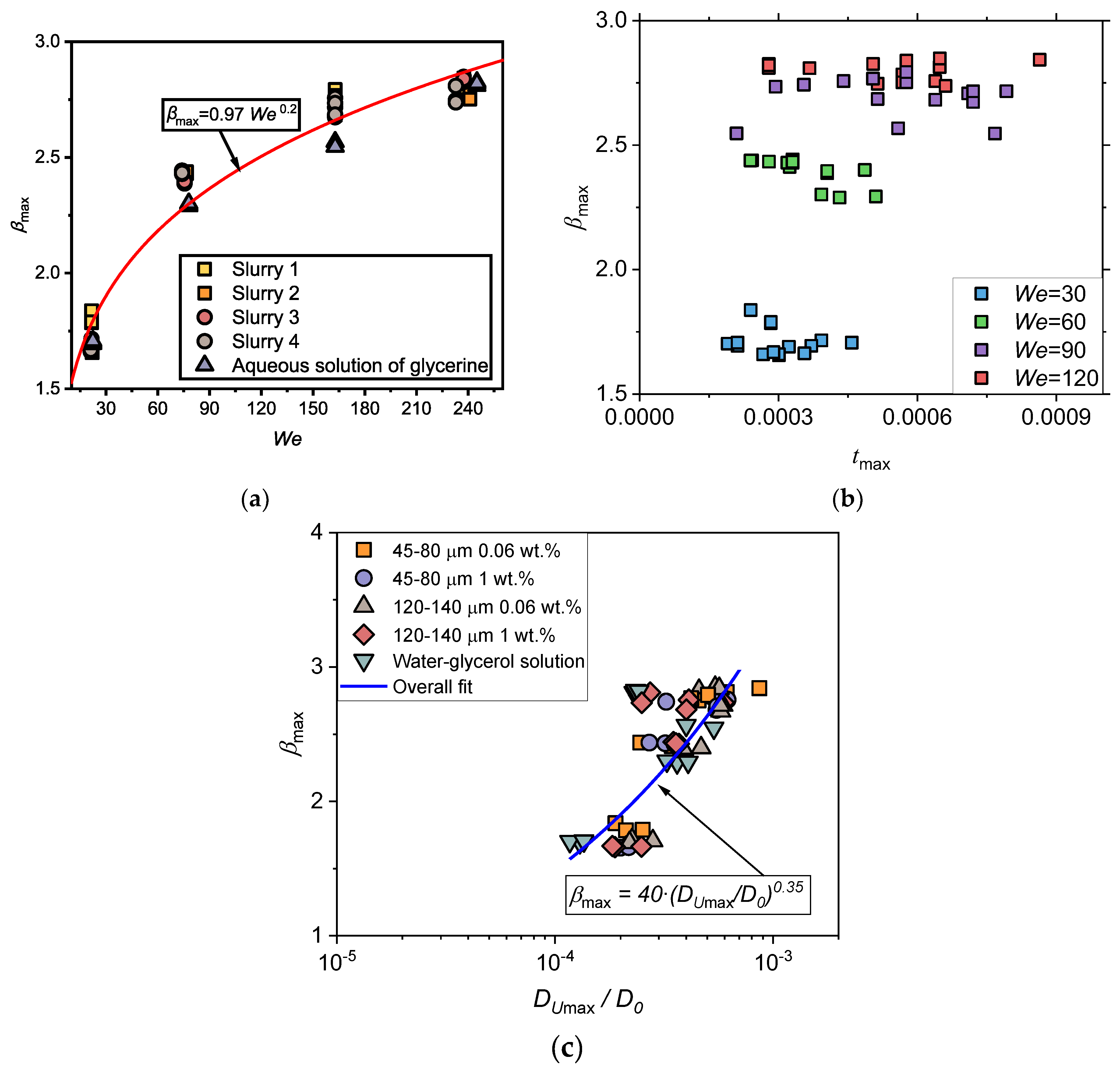In the previous subsection, it was shown that coal particles in a spreading drop can affect the internal flow velocities. If the velocity of internal flows in the drop increases, this should affect the spreading characteristics, in particular, the spreading diameter. Therefore, one of the key tasks of the study was to establish an implicit relationship between the velocity of internal flows in the longitudinal section of the drop and the factor of its maximum spreading βmax. To test this relationship, it was necessary to make sure that for all the liquids under study, the behavior of βmax is mainly determined by the initial drop velocity with the constancy of other terms within We. This confidence was achieved after summarizing the results in the framework of the relationship βmax = f(We) depicted in Figure 8a. The behavior of βmax for particle-laden and water–glycerol drops is governed by the power function of βmax = 0.97We0.2 with R2 = 0.95.
