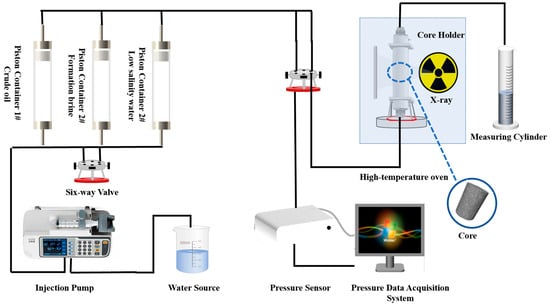 A core sample (sandstone) was taken from the sandstone reservoir of a certain offshore oilfield at a depth of 1121.6 m. The gas permeability was measured to be 859.0 mD, with a porosity of 31.62%. The dimensions were 25 mm × 26 mm, and it was subsequently cut into 8 mm × 16 mm pieces. To enhance imaging quality, the experimental oil used was a mixture of crude oil produced from a specific block in the Bohai Oilfield and 10% diiodoethane (Chengdu Kelong Chemical Co., Ltd., Chengdu, China) (The X-ray attenuation coefficients of pure crude oil and experimental water exhibit minimal differences, resulting in low gray-scale contrast between oil and water phases during CT scanning, making precise differentiation challenging. In contrast, diiodoethane contains iodine with a high atomic number, significantly enhancing the X-ray attenuation coefficient of the oil phase. This creates distinct grayscale differences between the oil phase, water phase, and rock matrix within CT images. The properties of the experimental oil are shown in Table 1 (the bituminous matter content is determined using the n-heptane precipitation method specified in industry standard SY/T 5119-2016 [22] “Determination of Bituminous Matter Content in Rocks and Crude Oil.”). The wax content is determined using gas chromatography-mass spectrometry (GC-MS), Thermo Fisher Scientific, Waltham, MA, USA. The experimental water was prepared based on the ion composition of formation water from a certain block in the Bohai Oilfield. The composition of the simulated formation water and low-mineralization displacement water is shown in Table 2. The mineralization of the simulated formation water was 10,311.72 mg/L, and the low-mineralization displacement water was prepared by diluting the formation water four times.
