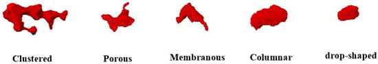During the experiment, consistent with the method described in Section 2.3, a three-dimensional visualization model of remaining oil distribution in the core was constructed through consistent denoising, smoothing, and oil phase extraction. The pore space structure types of micro-scale reservoir rocks significantly influence the enrichment patterns of remaining oil, resulting in diverse distributions of remaining oil at the pore scale. By combining the three-dimensional shape factor G with the Euler number EN of the pore space, the micro-scale distribution forms of remaining oil can be quantitatively distinguished into five types: cluster-like, porous, membrane-like, columnar, and droplet-like [26,27], as shown in Figure 2.