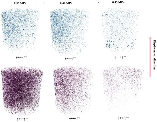 In this experiment, in situ scanning technology was used to perform micron CT scanning on sandstone cores. After scanning, the data volumes in different states were spatially aligned to ensure that the spatial positions of pores and particles remained consistent across all data volumes. During image processing, Avizo 2024.2 was used to analyze the CT scan images. First, a non-local filter was applied to the images for noise reduction and smoothing, facilitating the distinction between oil and water phases. Based on the differing X-ray attenuation coefficients of the rock matrix, oil phase, and water phase, threshold segmentation was performed using the watershed algorithm. The segmentation threshold was verified by ±2 gray values, and the oil phase recognition error was less than 5%. The voxel resolution is 10 µm per pixel, which has limitations on the characterization of micropores smaller than 5 µm. The coefficient of variation in the remaining oil saturation in the three repeated experiments was less than 3%, ensuring the reproducibility of the results [23].