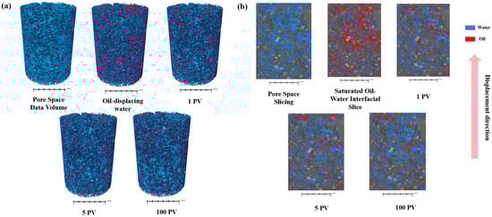 (a) Three-dimensional oil-water distribution maps at different PV injection stages; (b) pore volume cross-section diagrams at different PV injection stages.