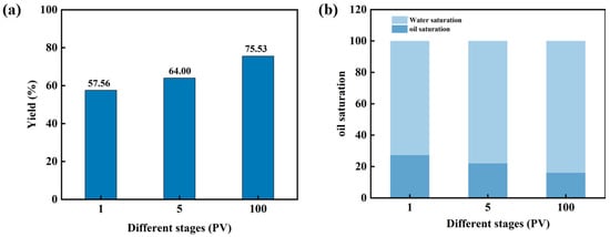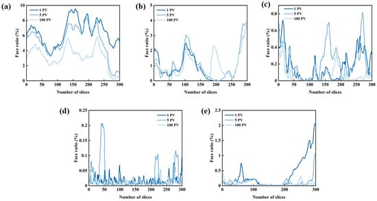 Analysis of the variation in droplet-like remaining oil: Droplet-like remaining oil consists of small oil droplets distributed in microscopic pores, constrained by the Jamin effect [38]. Under initial water-flooded conditions, the content of droplet-type remaining oil is relatively low. At 5 PV, there is a significant increase in droplet-type remaining oil in some areas. Analysis suggests that other types of remaining oil are being mobilized, forming new droplet-type remaining oil. However, when the water injection volume reaches 100 PV, the droplet-type remaining oil is quickly carried away by the continuously injected fluid, causing the proportion of droplet-type remaining oil to begin decreasing again.