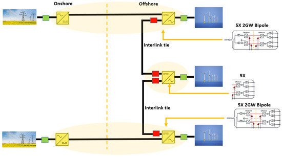 Figure 8 illustrates a conceptual offshore network configuration constructed using 2-GW bipolar HVDC modules, which are aggregated to form 10-GW offshore wind clusters. The design incorporates an inter-cluster tie line sized at 40% of the capacity of each cluster, a value aligned with the typical average annual offshore wind capacity factor of about 40%. This sizing ensures that the tie line can accommodate the majority of available generation under normal operating conditions, while limiting curtailment during contingency events or scheduled outages. In the configuration shown, the interlink is rated at 4 GW, corresponding to 40% of the total 10-GW generation capacity of the cluster. This approach provides N-1 contingency capability for the HVDC export paths, enhancing overall system robustness and ensuring high reliability and availability for OSW delivery to the onshore grid.