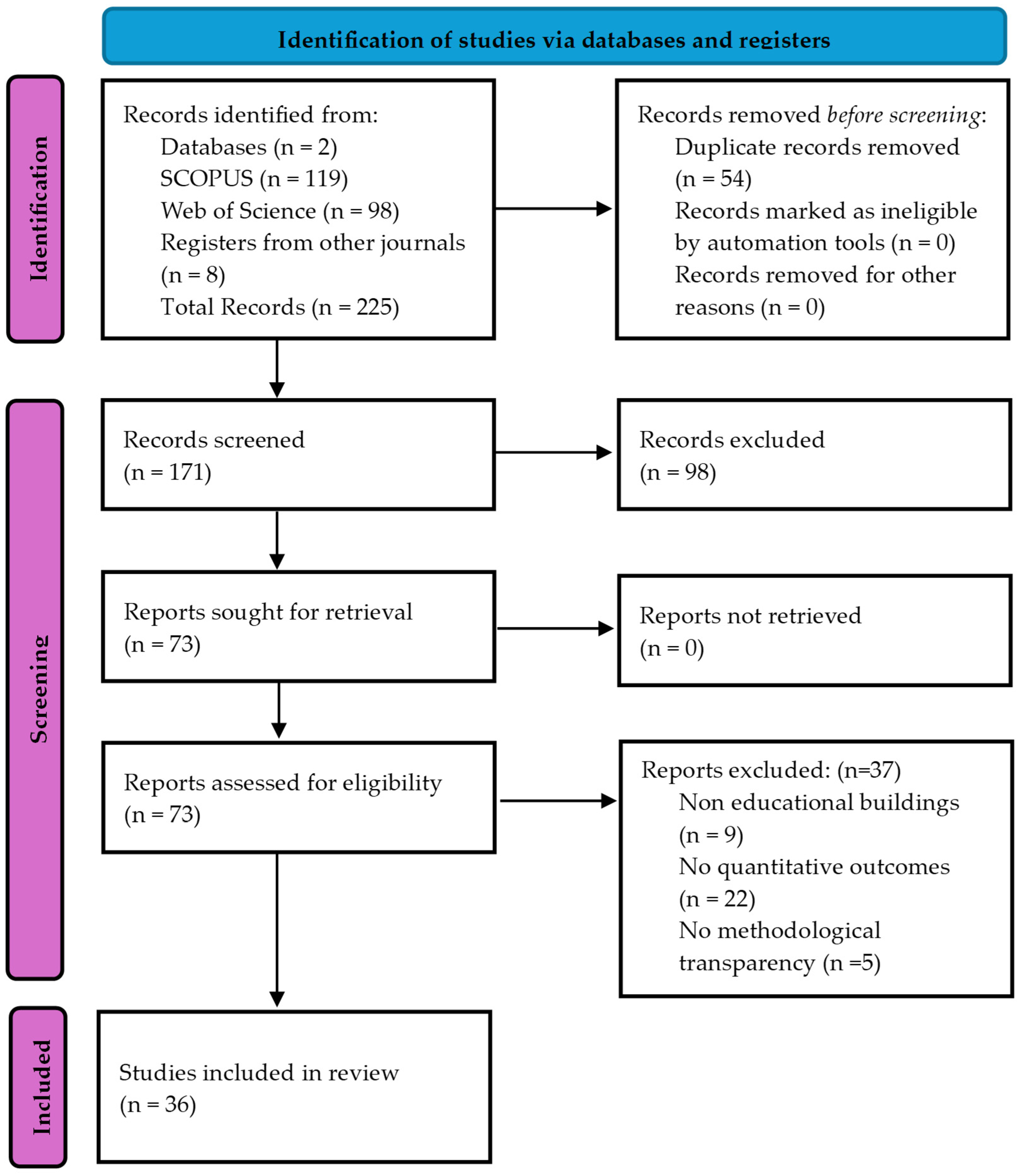 Figure 1) summarizes the selection process. From 225 records identified, we removed 54 duplicates and screened 171 titles and abstracts. Following title and abstract screening, 98 records were excluded. We assessed 73 full-text articles for eligibility and excluded 37 studies. Among excluded studies, 22 lacked quantitative data, 9 focused on non-educational buildings, and 5 demonstrated insufficient methodological transparency. Final review incorporated evidence from 36 studies, though not all studies contributed data to all analyses due to heterogeneity in reporting.
