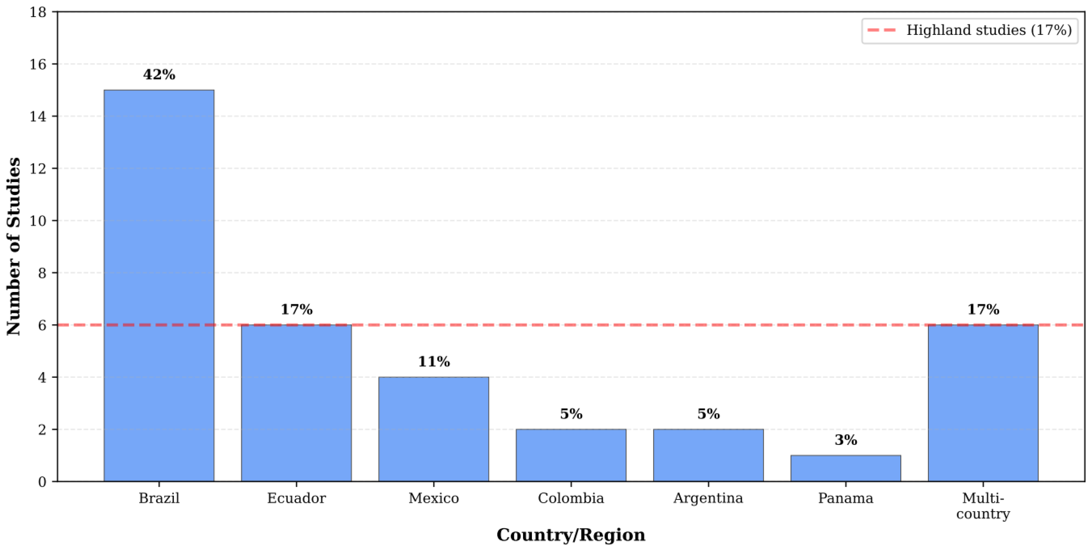 Figure 2 illustrates the pronounced geographic concentration, with Brazil accounting for 42% of publications dominating the research landscape, contributing 15 studies, followed by Ecuador with six studies (17%), Mexico with four (11%), and Colombia and Argentina contributed two studies each (5%), and Panama one (3%), while six studies (17%) encompassed multiple countries.