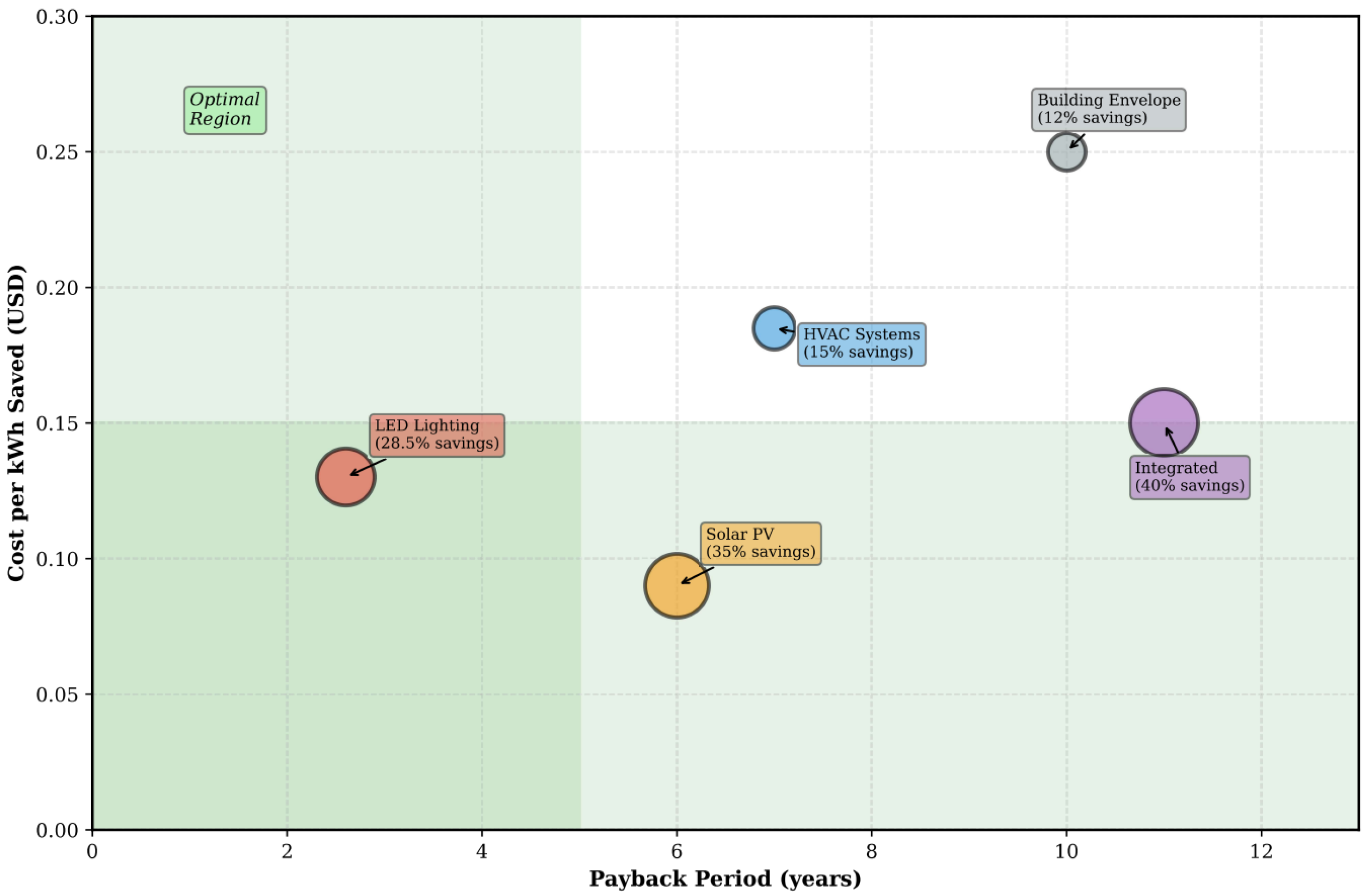 Energy reductions ranged 10–40% of baseline consumption (median 18.5%), with extreme cases reaching 60%. Annual cost savings spanned USD 2000–USD 218,426 per building (median USD 12,500), though only 23.5% of studies reported comprehensive financial data. Carbon emission reductions of 79–497 tons CO2 annually appeared in just 29.4% of publications. Technology-specific performance showed clear patterns: LED lighting retrofits (20–43% reduction, 2.6-year payback), HVAC optimization (8–25% savings, 7-year payback), building envelope improvements (2–24% reduction, 10-year payback), solar PV (20–52% grid reduction, 6-year payback), and integrated approaches (30–60% savings, 11-year payback).