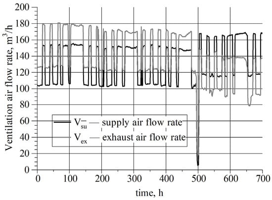 High-resolution data derived from [6] were used as part of the input data acquisition technique. The ventilation air flow rates and the heat recovery efficiency were obtained as a result of recording (with the KD7 (LUMEL S.A., Zielona Góra, Poland), data logger) the air flow measurements of the supply and exhaust air and the temperatures of the supply, return, exhaust, and outdoor air (at intervals of 1 min). Ventilation air flow rates change over time. This may result from changes in wind speed and direction, thermal buoyancy, and air filter clogging. In addition, the failure in the air handling unit was resolved (partial opening of the bypass damper of the heat exchanger for about 500 h), which caused a significant change in ventilation air flow rates and heat recovery efficiency. The measured air flows and heat recovery efficiency values based on the measurements are presented in Figure 5 and Figure 6, respectively.