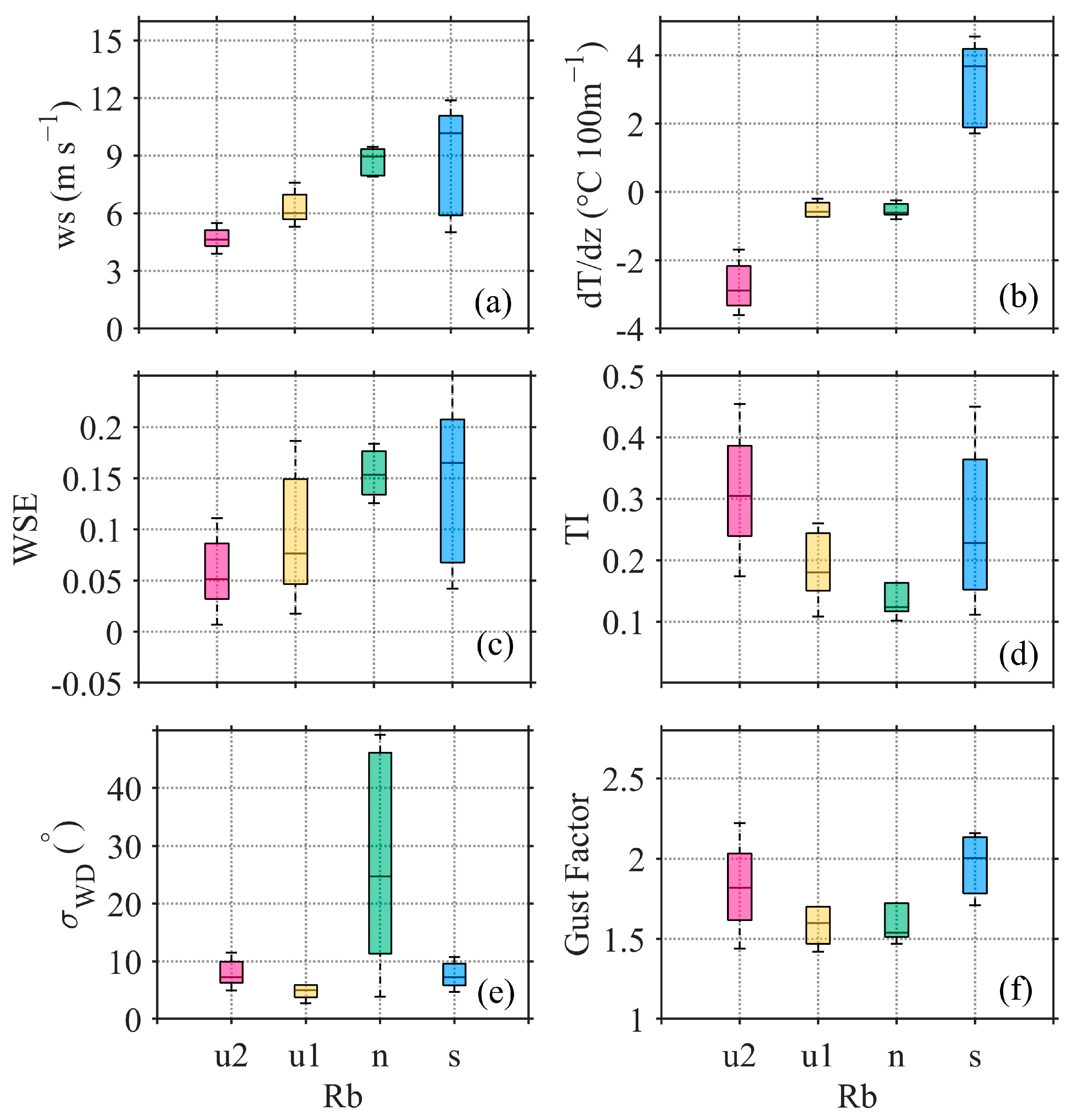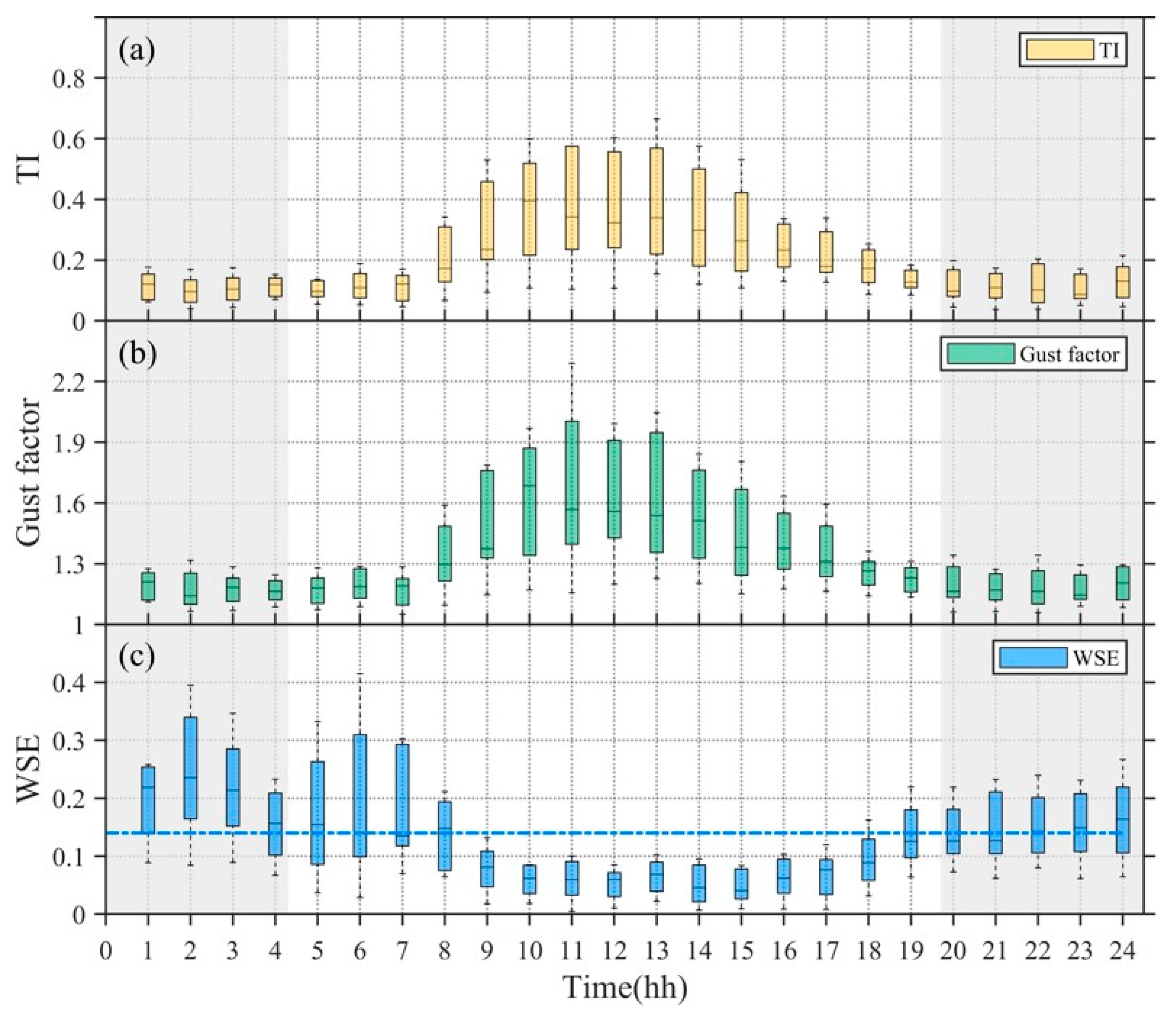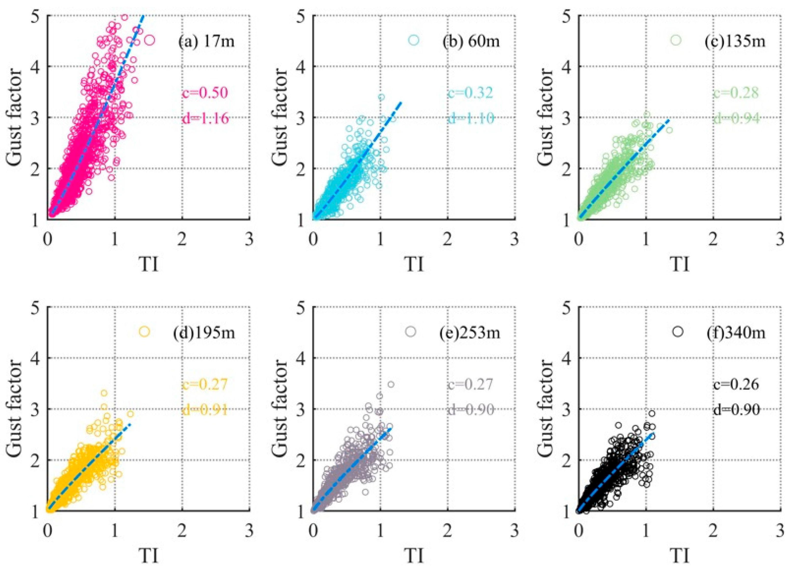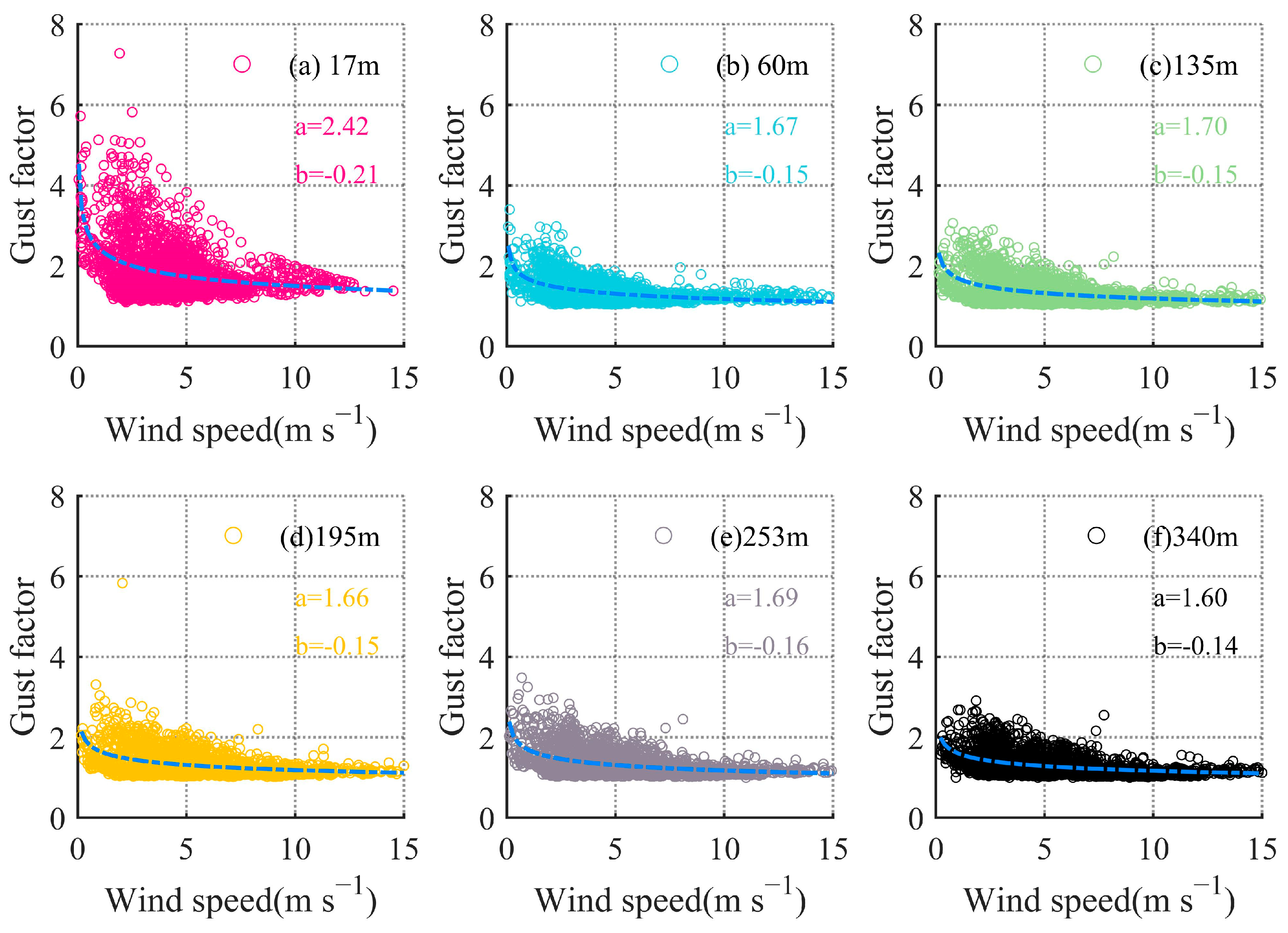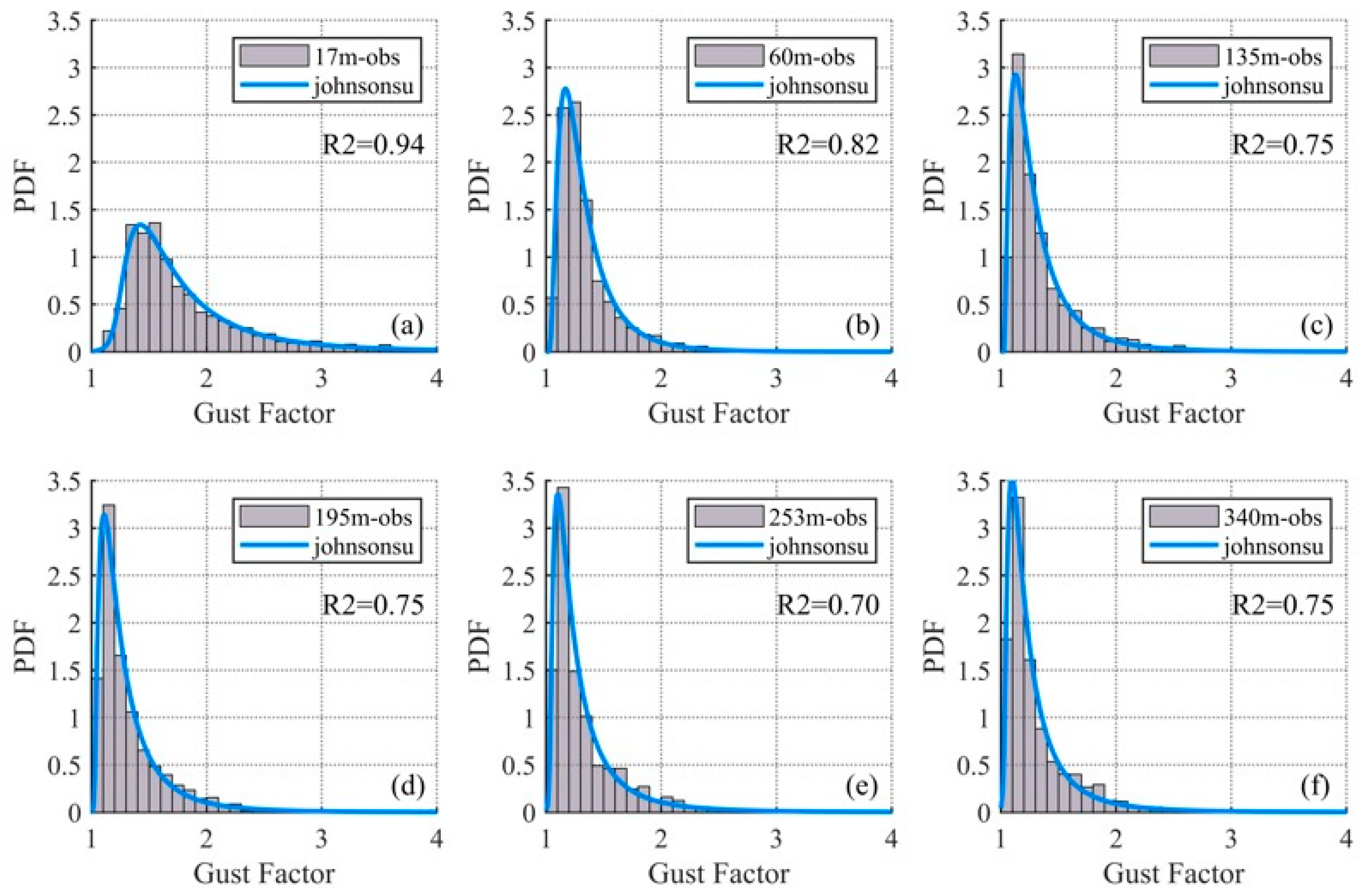 3.1. Characteristics of the Atmospheric Turbulence Intensity, Gust Factor, and Wind Shear Exponent