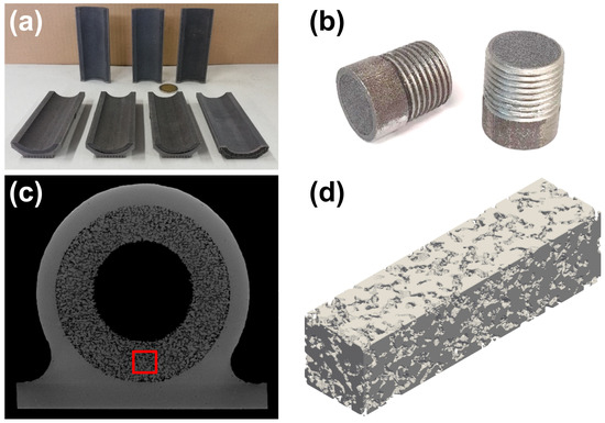 Samples and reconstructed domains analyzed in this study: (a) samples manufactured for the capillary rise tests; (b) samples prepared for the mass flow rate tests; (c) section of the HP from which the µCT reconstruction with porosity (highlighted in red) was extracted; (d) isosurface describing the solid boundary in the µCT reconstruction for the virtual sample with porosity .