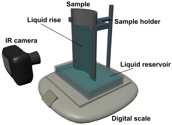 In the first method, the height reached by the liquid within the wick was recorded using a FLIR T450sc infrared camera (FLIR Systems, Wilsonville, OR, USA), which was used solely to track the liquid–vapor interface from the contrast between wet and dry regions, without requiring emissivity calibration. The wet region of the sample exhibited different emissivity from the dry aluminum and a cooling effect due to liquid evaporation. From the recorded height, the mass rise was calculated as the product of the liquid height, sample cross-section, porosity, and fluid density.