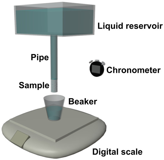 Experimentally, the measurement of K was performed by placing a liquid reservoir at fixed heights, H, above the porous sample, specifically at , , and . The reservoir dimensions were selected to limit variations in the liquid free-surface level. After pseudo-steady conditions were reached, the liquid flow rate through the sample was measured.