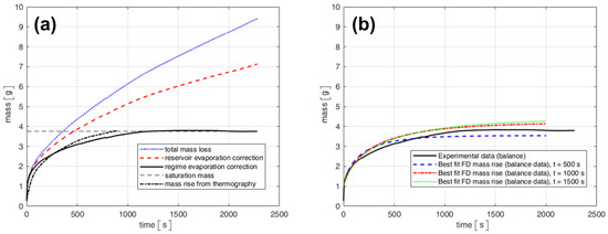 In the second method, the liquid level decrease in an input reservoir was recorded, with one end of the sample immersed in it. All tests were performed under stable laboratory conditions, with an ambient temperature of approximately , and a correction was applied to account for liquid evaporation from both the reservoir and the sample surface. The evaporation from the reservoir was measured before the tests, while the additional evaporation from the wetted sample was quantified by calibration, comparing the evaporation rate with and without the sample fully imbibed and then linearizing the contribution associated with the exposed sample surface.