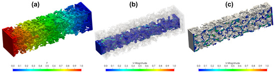 A no-slip boundary condition, corresponding to zero relative velocity and zero pressure gradient, was applied to all solid–liquid interfaces, including the sides of the inlet and outlet reservoirs and the channel walls. At the outlet, a fixed pressure was imposed in all simulations, set to zero because incompressible flow was assumed. At the inlet, a velocity-based boundary condition was applied by prescribing a fixed uniform velocity, which was set in the range – in both the validation cases and the final simulations of the porous structures.