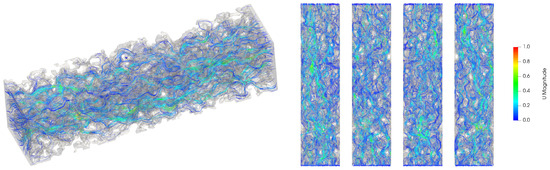 The geometry used for the FVM simulations was created by extracting the isosurface describing the solid–air interface from the binarized µCT reconstruction and exporting it as a stereolithography (STL) file. Two small reservoirs were added at the domain ends along the longitudinal direction to simplify the definition of the inlet and outlet boundary conditions and to facilitate permeability calculation during post-processing.