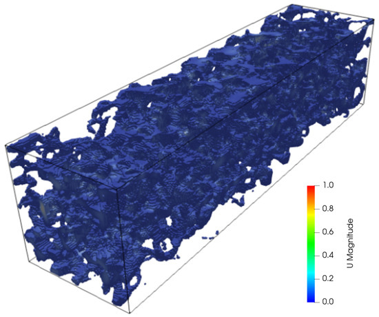 The domain was meshed using the OpenFOAM utilities blockMesh and snappyHexMesh. The first tool generated a structured background mesh, while the second selected all the cells enclosed by a specified 3D surface, namely the solid region described by the STL file, and adjusted the positions of the cell vertices so that the cell faces accurately followed the STL surface shape. The STL surface was imported without geometric smoothing or feature removal, and the mesh resolution was selected to ensure that all geometric features resolved by the µCT scan were preserved in the computational mesh. Since no local refinement regions were defined, the final mesh maintained good uniformity in the porous region. Only limited cell size variations appeared near the solid–fluid interface due to the snapping procedure, and the cells located close to the inlet and outlet boundaries were slightly larger.