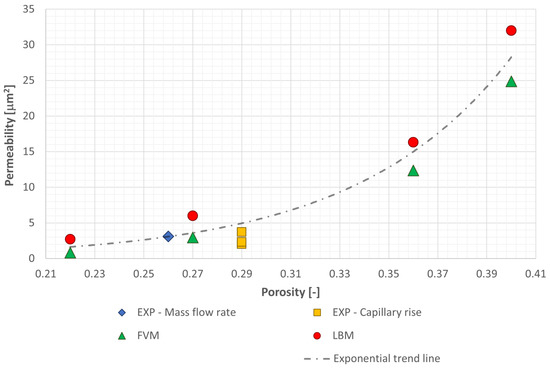 Given that, as previously discussed, all results align closely with exponential trends, an exponential fit was derived from the experimental (mass flow rate) and numerical data to express the permeability as a function of the porosity. This correlation was obtained directly from the present dataset, resulting in Equation (22):