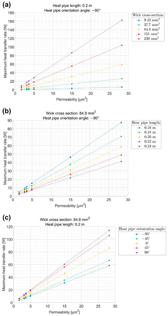 The obtained results are presented in Figure 13, which shows the maximum heat transfer rate as a function of permeability for the representative HPs described in Table 4. Panel (a) refers to varying wick cross sectional area at fixed HP length and orientation angle, panel (b) to varying HP length at fixed wick cross section and orientation angle, and panel (c) to varying orientation angle at fixed wick cross section and HP length.